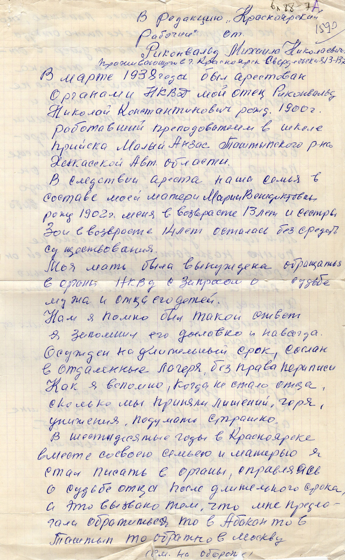 В шестидесятые годы в Красноярске вместе со своею семьею и матерью я стал писать в органы, справляясь о судьбе отца после длительного срока, а это вызвано тем, что мне предлогали обратиться то в Абакан то в Таштып то обратно в Москву.