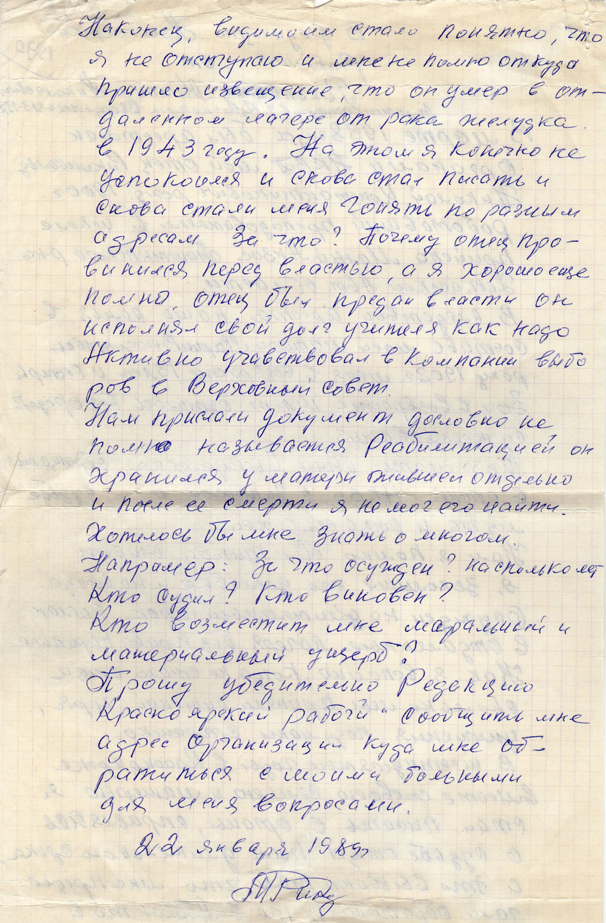 Прошу убедительно Редакцию «Красноярский рабочий» сообщить мне адрес организации куда мне обратиться с моими больными для меня вопросами.