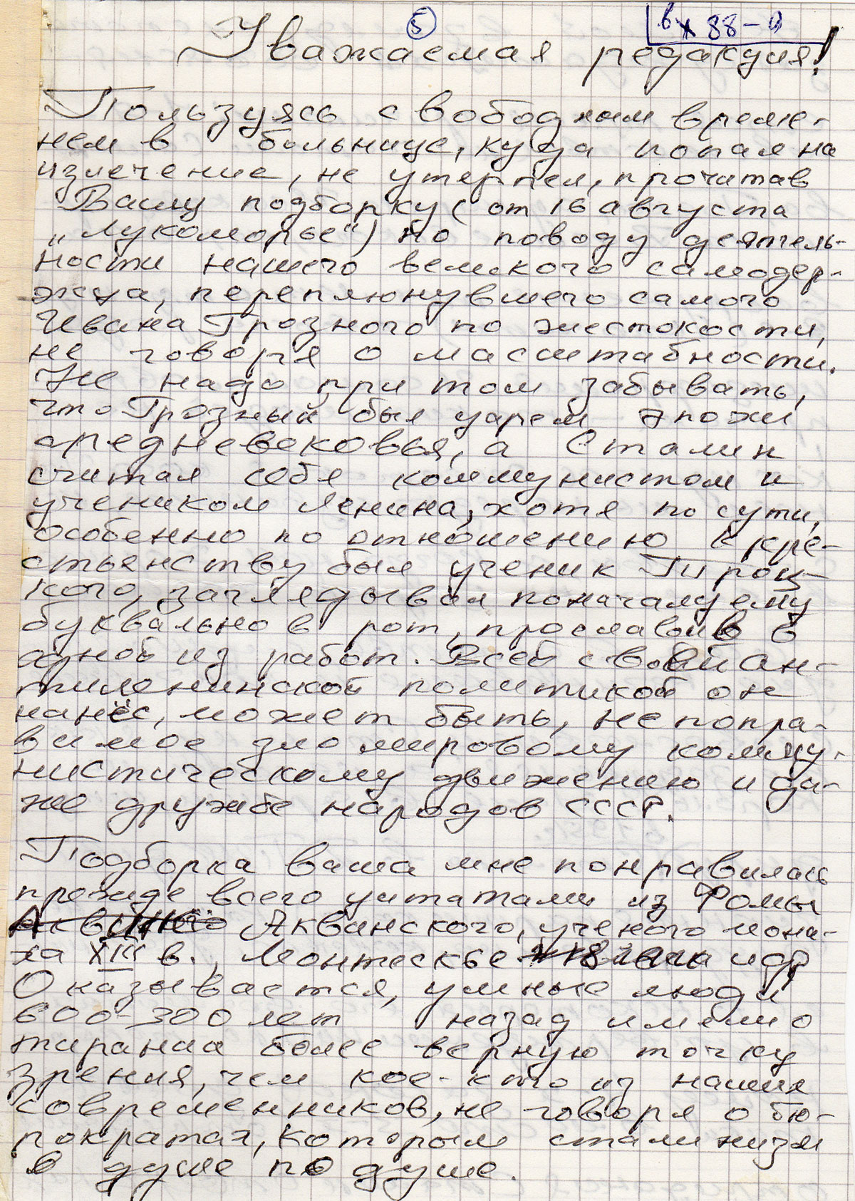 Пользуясь свободным временем в больнице, куда попал на излечение, не утерпел, прочитав Вашу подборку (от 16 августа «Лукоморье») по поводу деятельности нашего великого самодержца, переплюнувшего самого Ивана Грозного по жестокости, не говоря о масштабности. Не надо при том забывать, что Грозный был царем эпохи средневековья, а Сталин считал себя коммунистом и учеником Ленина, хотя по сути, особенно по отношению к крестьянству был ученик Троцкого, заглядывал поначалу ему буквально в рот, прославив в одной из работ. Всей своей антиленинской политикой он нанёс, может быть, непоправимое зло мировому коммунистическому движению и даже дружбе народов СССР.