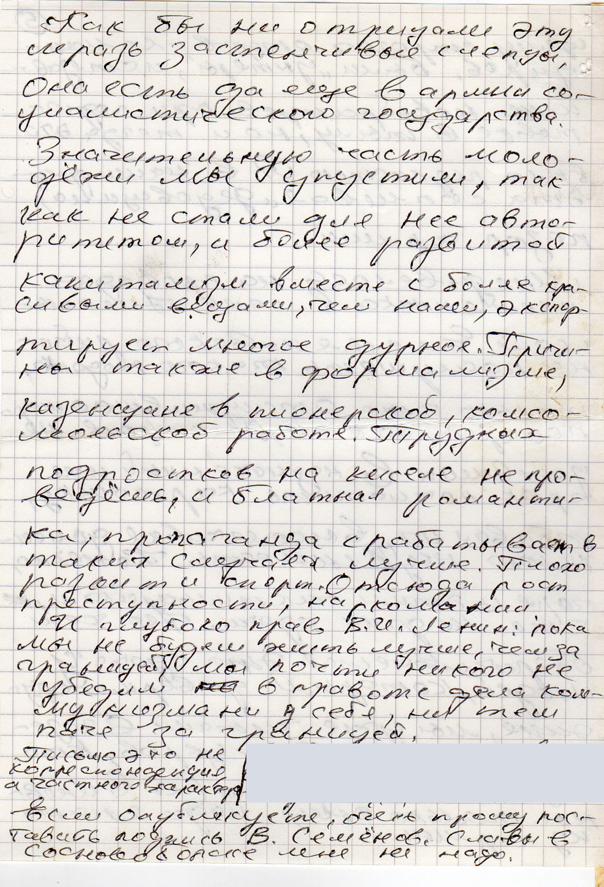 Письмо это не корреспонденция, а частного характера. Если опубликуете, очень прошу поставить подпись В. Семёнов. Славы в Сосновоборске мне не надо.