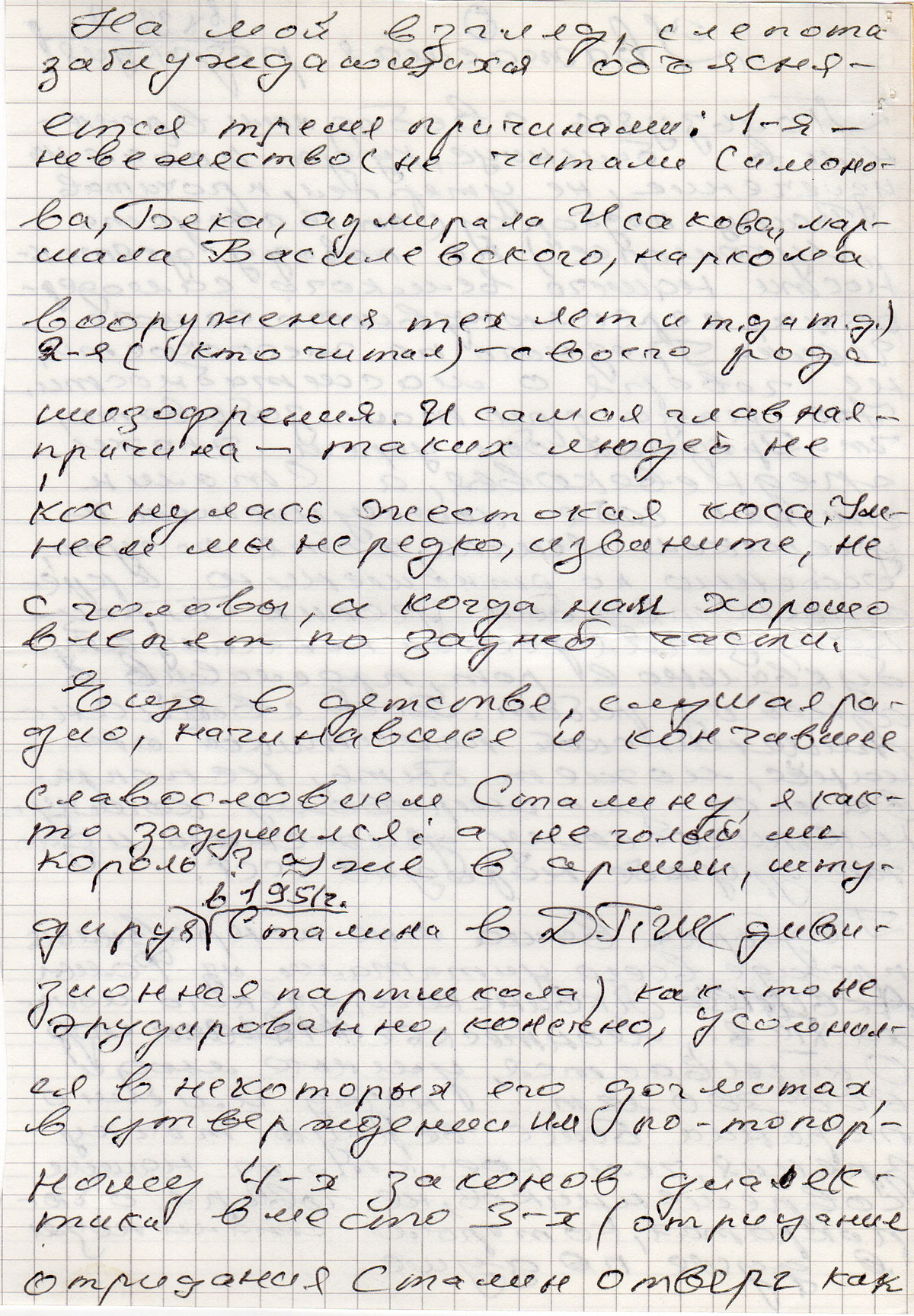 Ещё в детстве, слушая радио, начинавшее и кончавшее славословием Сталину, я как-то задумался: а не голый ли король? Уже в армии, штудируя в 1951 г. Сталина в ДПШ (дивизионная партшкола) как-то не эрудированно, конечно, усомнился в некоторых его догматах, в утверждении им по-топорному 4-х законов диалектики вместо 3-х (отрицание отрицания Сталин отверг как устаревшее). Об этом я по наивности сказал преподавателю. По счастью он оказался порядочным человеком и просто сказал мне, что у Сталина нет ошибок.