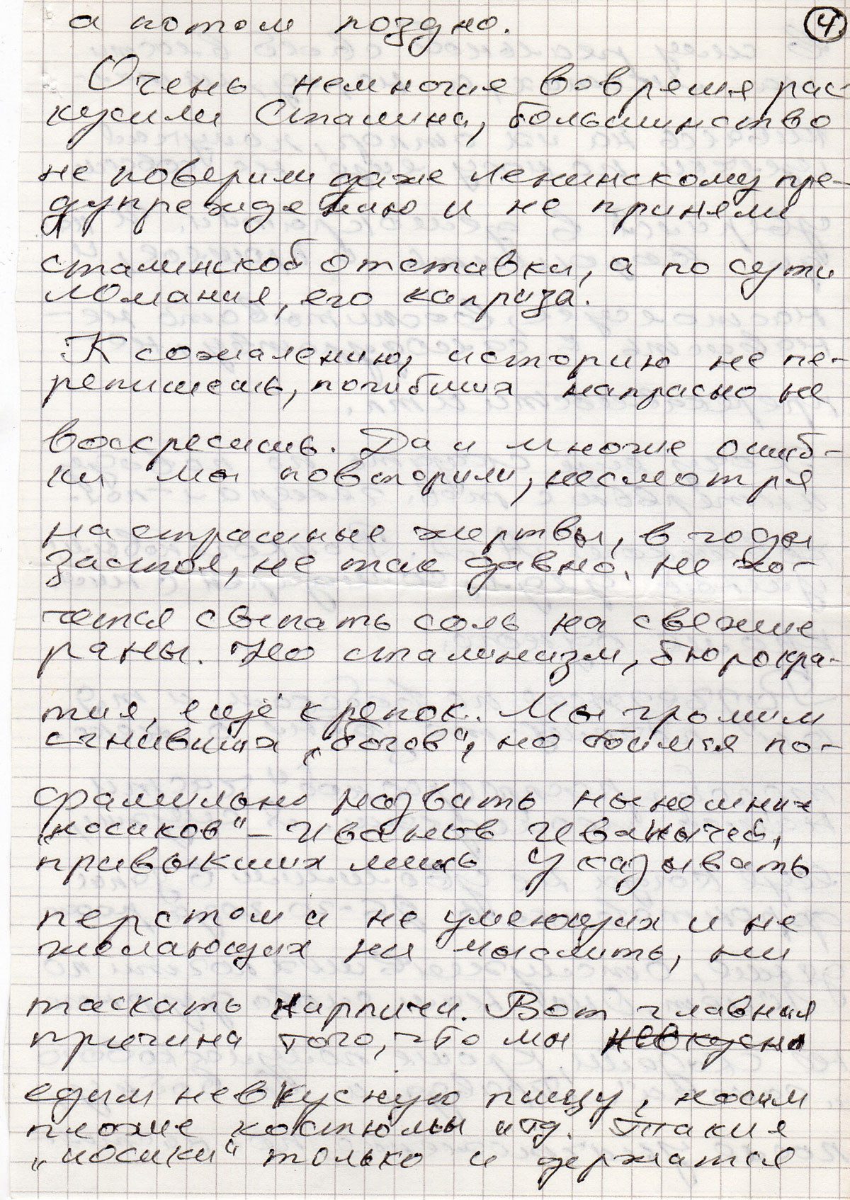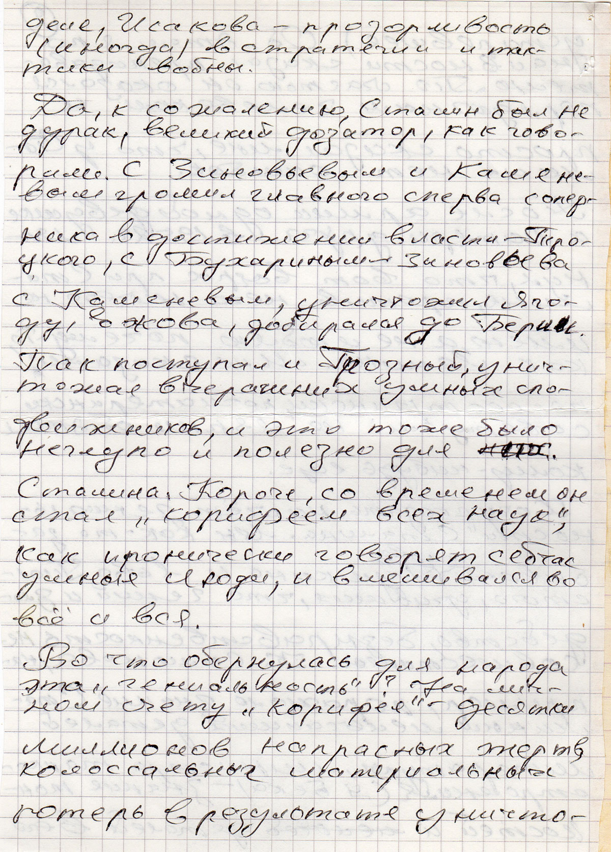 К сожалению, историю не перепишешь, погибших напрасно не воскресишь. Да и многие ошибки мы повторили, несмотря на страшные жертвы, в годы застоя, не так давно, не хочется сыпать соль на свежие раны. Но сталинизм, бюрократия, ещё крепок. Мы громим сгнивших «богов», но боимся пофамильно назвать нынешних «иосиков» - Иванов Иванычей, привыкших лишь указывать перстом и не умеющих и не желающих ни мыслить, ни таскать кирпичи. Вот главная причина того, что мы невкусно едим невкусную пищу, носим плохие костюмы и т.д. Такие «иосики» только и держатся в силу реальной своей власти на местах, а народ, наталкиваясь на их отпор, получая щелчки по носу еще не совсем уверился в демократии. И надо ворошить прошлое, и настоящее, воспитывать ненависть к самодурству, непререкаемости и тп.