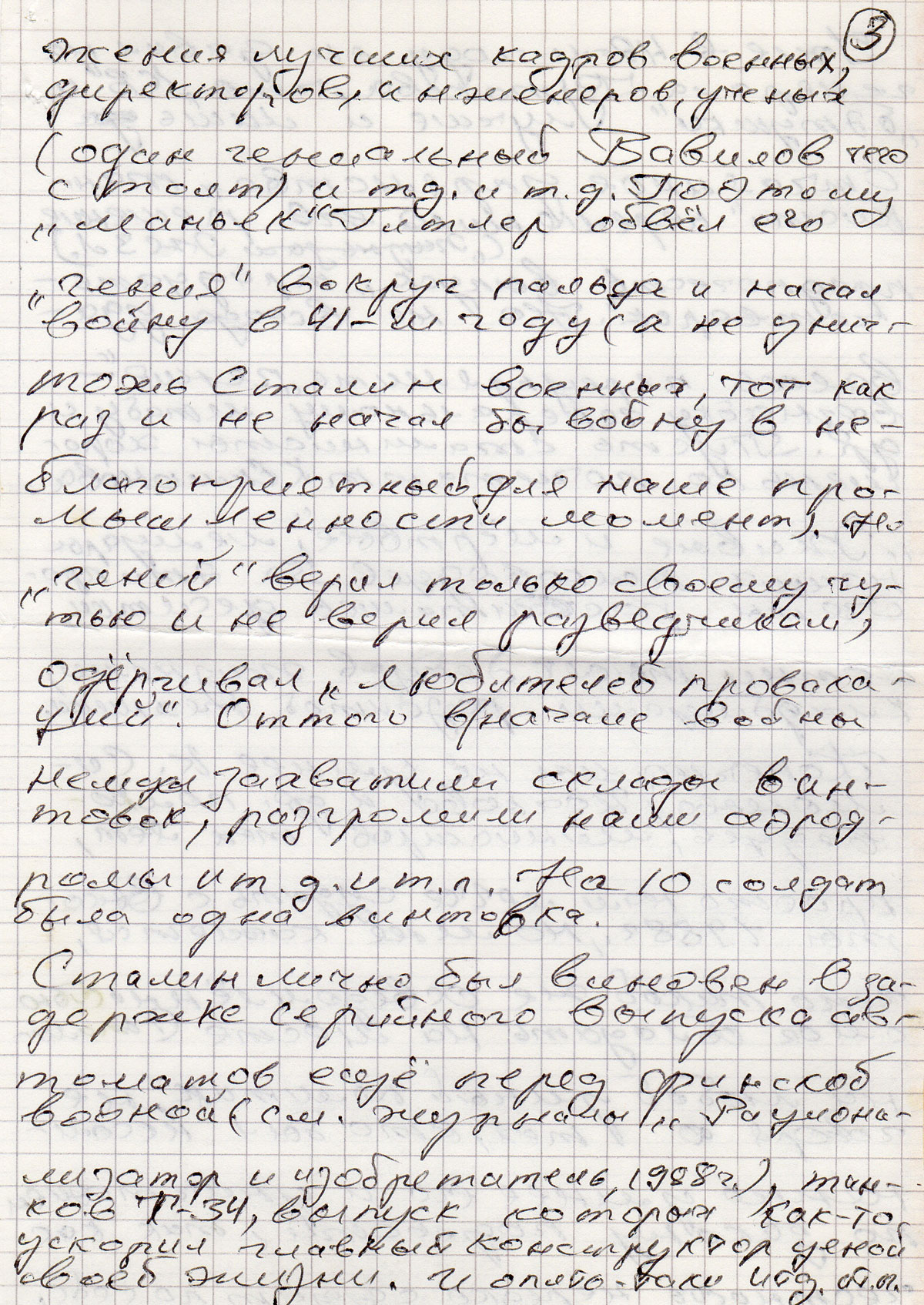 Сталин лично был виновен в задержке серийного выпуска автоматов ещё перед финской войной (см. Журналы «Рационализатор и изобретатель», 1988 г.), танков Т-34, выпуск которых как-то ускорил главный конструктор ценой своей жизни. И опять-таки и т.д. т.п.