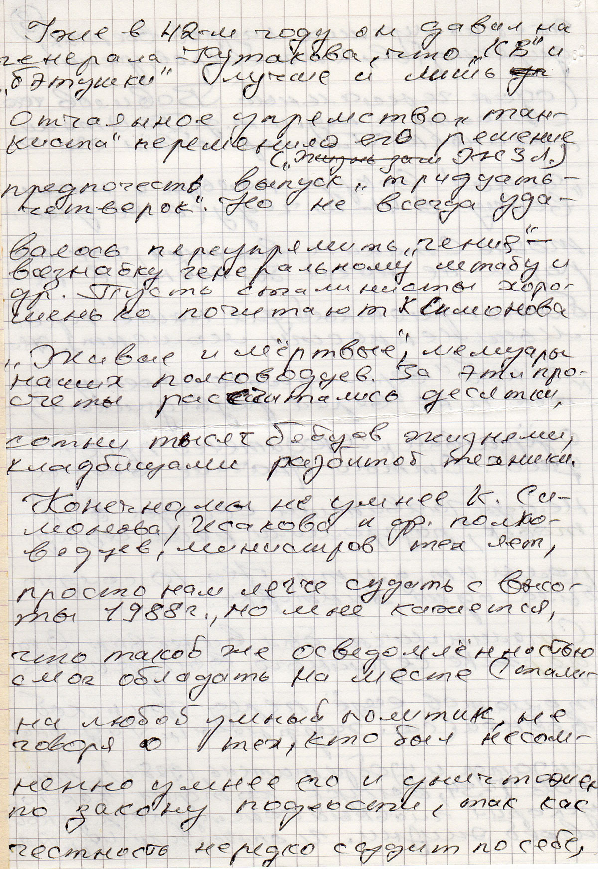 Конечно, мы не умнее К. Симонова, Исакова и др. полководцев, министров тех лете, просто там легче судить с высоты 1988 г., но мне кажется, что такой же осведомленностью смог обладать на месте Сталина любой умный политик, не говоря о тех, кто был несомненно умнее его и уничтожен по закону подлости, так как честность нередко судит по себе, а потом поздно.
