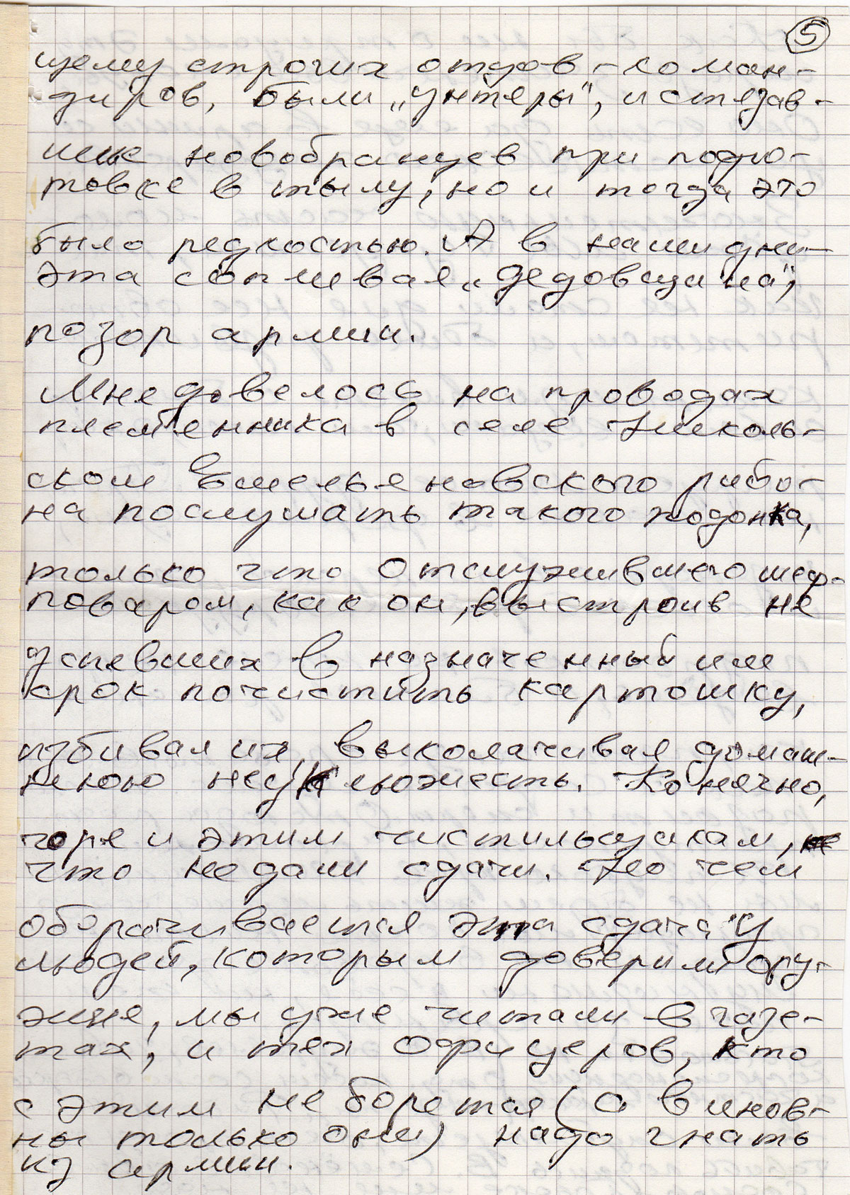 Мне довелось на проводах племянника в селе Никольском Емельяновского района послушать такого подонка, только что отслужившего шеф-поваром, как он, выстроив не успевших в назначенный им срок почистить картошку, избивал их, выколачивая домашнюю неуклюжесть. Конечно, горе и этим чистильщикам, что не дали сдачи. Но чем оборачивается эта сдача у людей, которым доверили оружие, мы уже читали в газетах, и тех офицеров, кто с этим не борется (а виноваты только они) надо гнать из армии.
