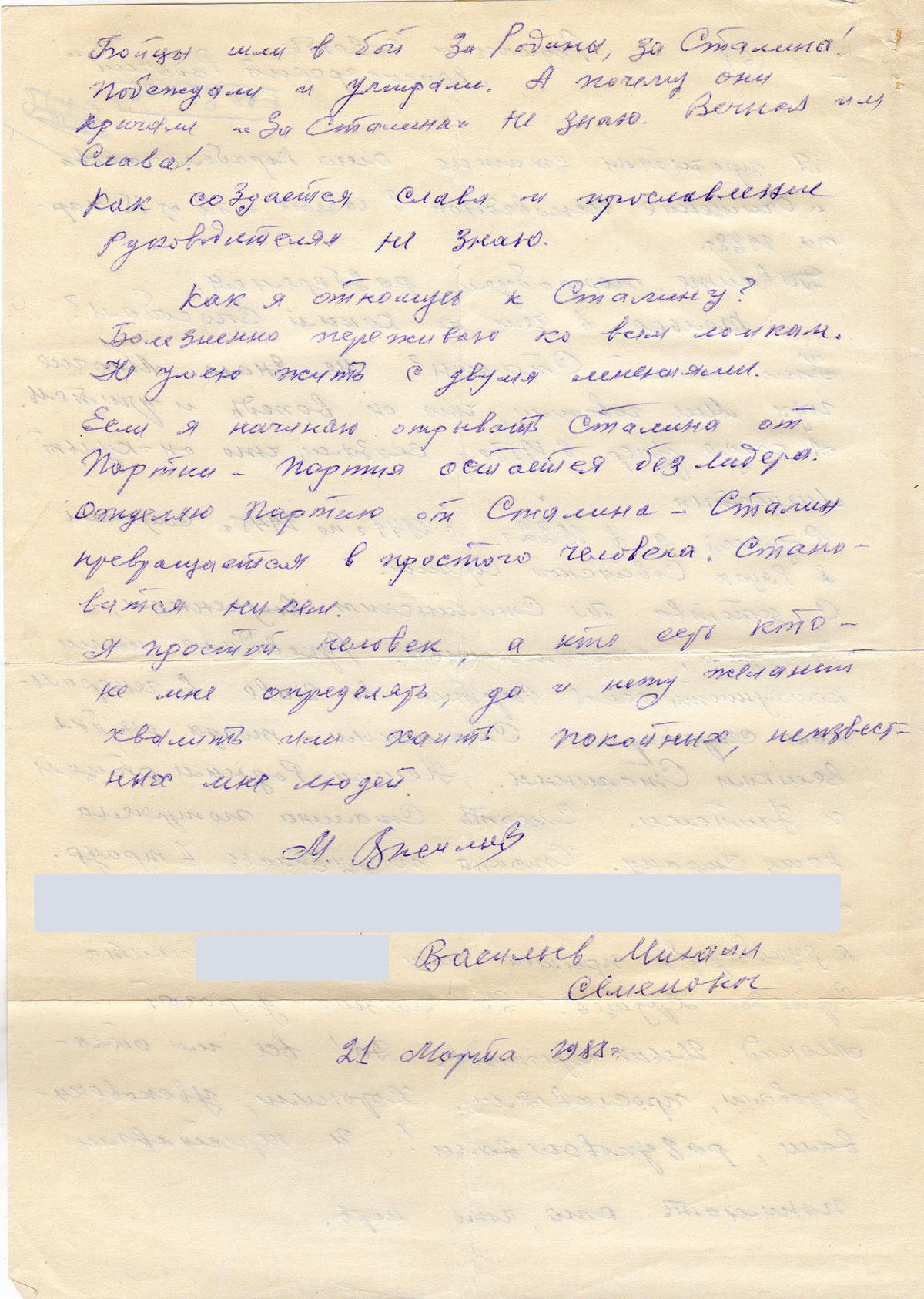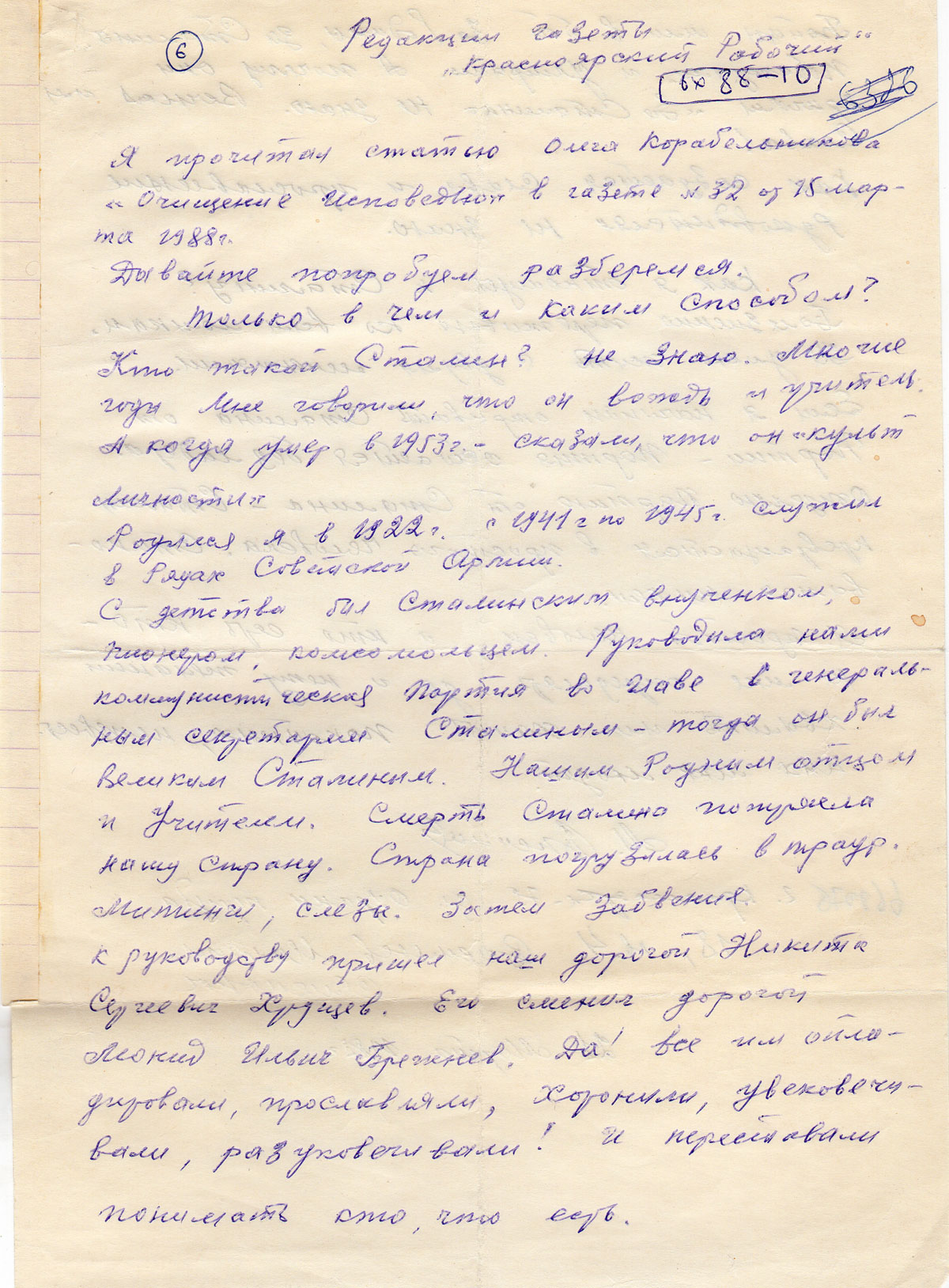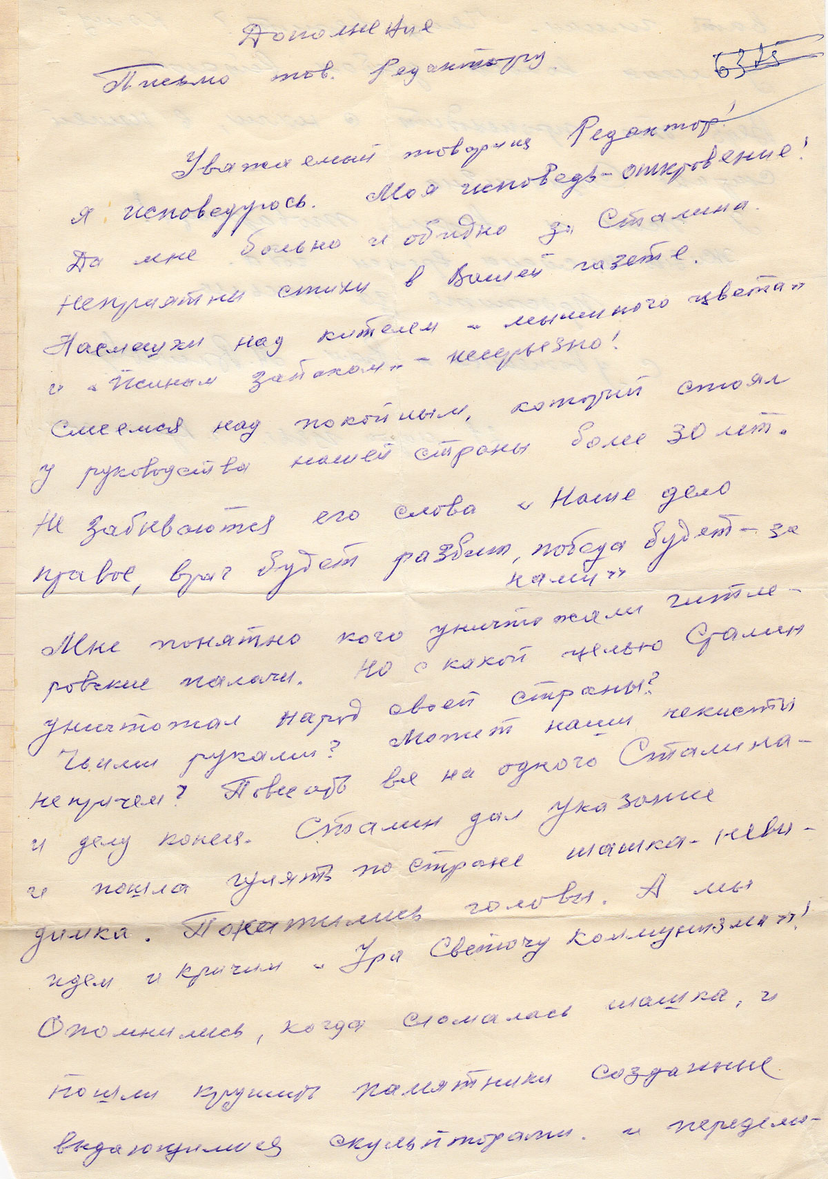 Я исповедуюсь. Моя исповедь - откровение! Да мне больно и обидно за Сталина. Неприятны стихи в Вашей газете. Насмешки над кителем “мышиного цвета” и “псиным запахом” - несерьезно!