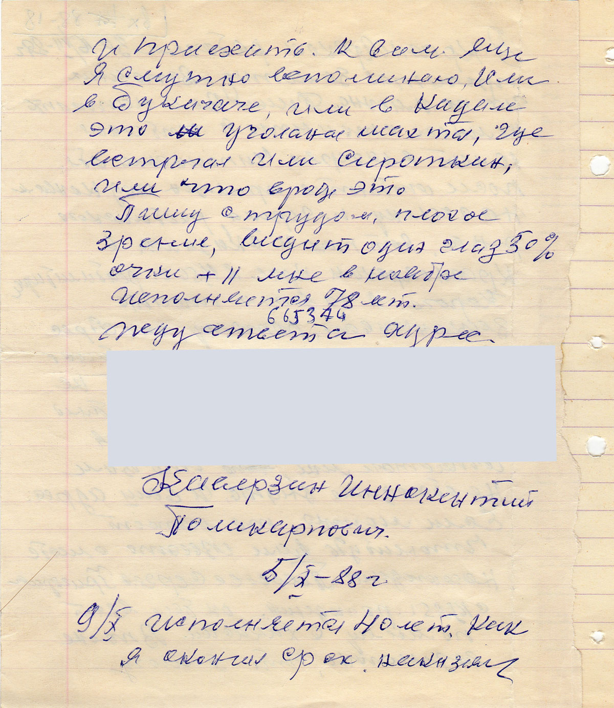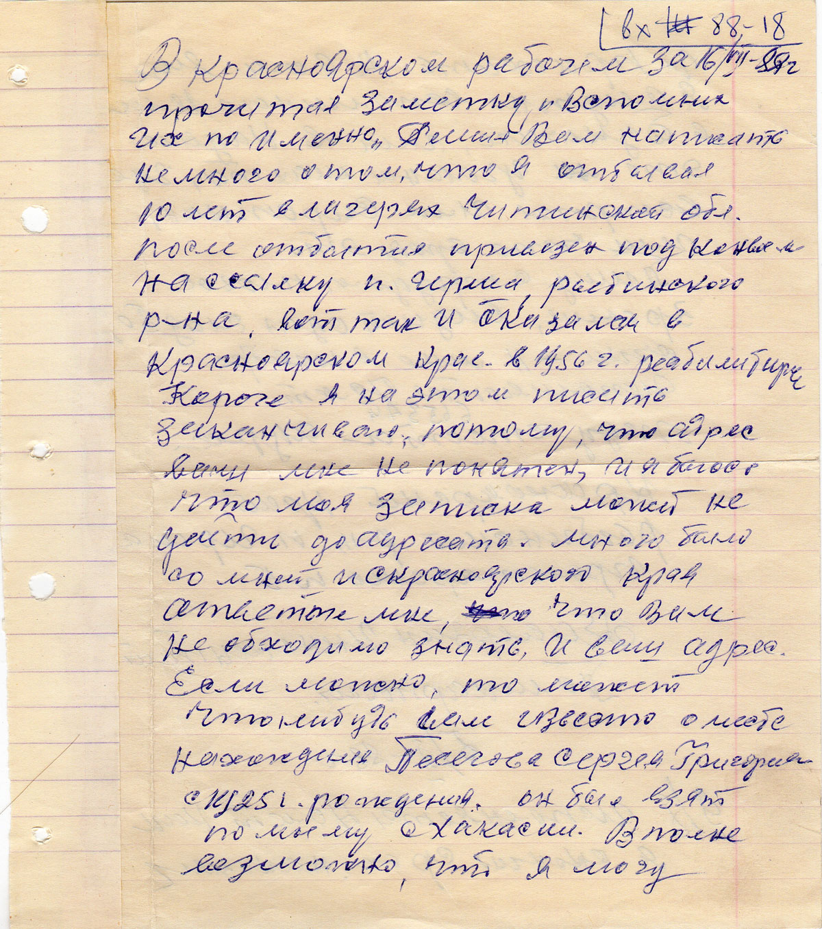 В Красноярском рабочем за 16 VII 88г. прочитал заметку «Вспомни их по именно». Решил Вам написать немного о том, что я отбывал 10 лет в лагерях Читинской обл. После отбытия привезен под конвоем на ссылку п. Ирша Рыбинского р-на, вот так и оказался в Красноярском крае. в 1956 г реабилитирован. Короче я на этом писать заканчиваю, потому, что адрес ваш мне не понятен, и я боюсь, что моя записка может не дойти до адресата. Много было со мной и с Красноярского края атветили мне, что Вам не обходимо знать. И ваш адрес. Если можно, то может что нибудь вам известо о месте нахождения Песегова Сергея Григорьевича. С 1925 г. рождения, он был взят по моему с Хакасии. Вполне возможно, что я могу и приехать к вам. еще я смутно вспоминаю или в Букачаче, или в Кадале это уголана (имеется в виду угольная) шахта, где встречал или Сироткин, или что вроде это.