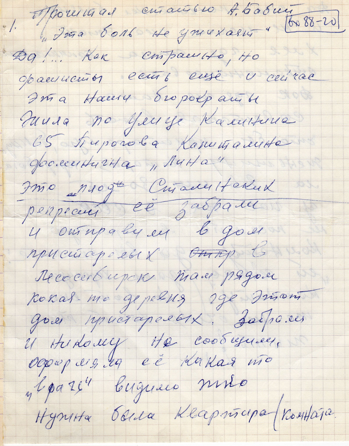 Это «плод» Сталинских репресий её забрали и отправили в дом пристарелых в Лесосибирск там рядом кокая-то деревня где этот дом пристарелых. Забрали и никому не сообщили. Оформяла её какая то «врачь» видимо, ей нужна была квартира (комната).