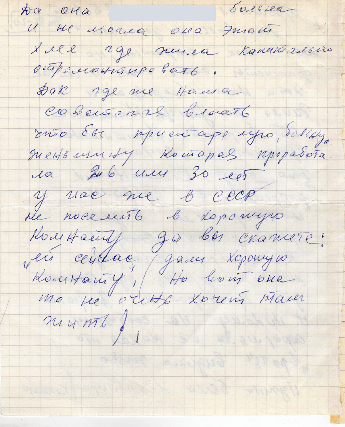 Дак где же наша советская власть что бы пристарелую, больную женьщину которая проработала 26 или 30 лет у нас же в СССР не поселить в хорошую комнату да вы скажете: «ей сейчас дали хорошую комнату», но вот она то не очень хочет там жить.