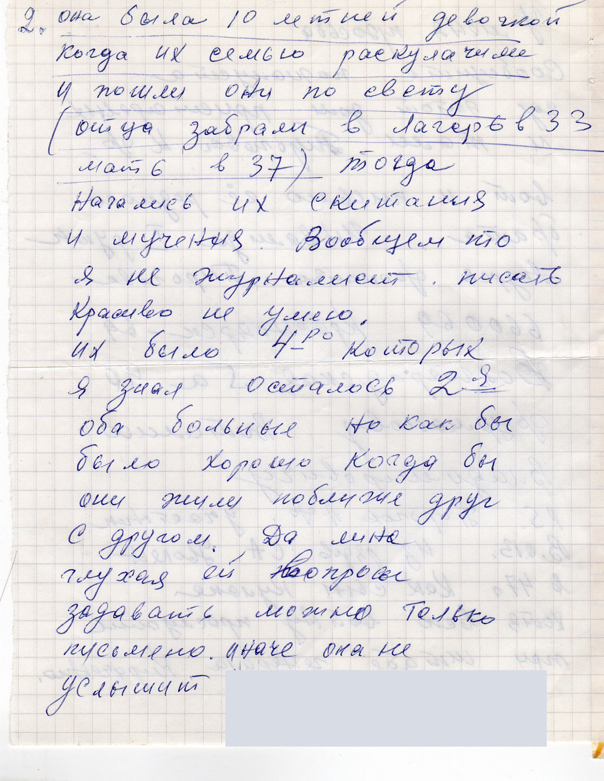 1. Она была 10 летней девочкой когда их семью раскулачили и пошли они по свету (отца забрали в лагерь в 33 мать в 37) тогда начались их скитания и мучения. Вообщем то я не журналист писать красиво не умею.