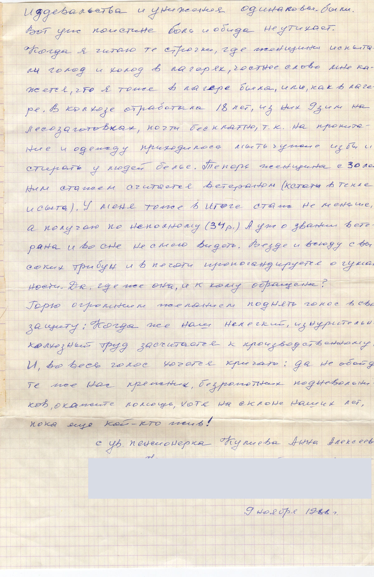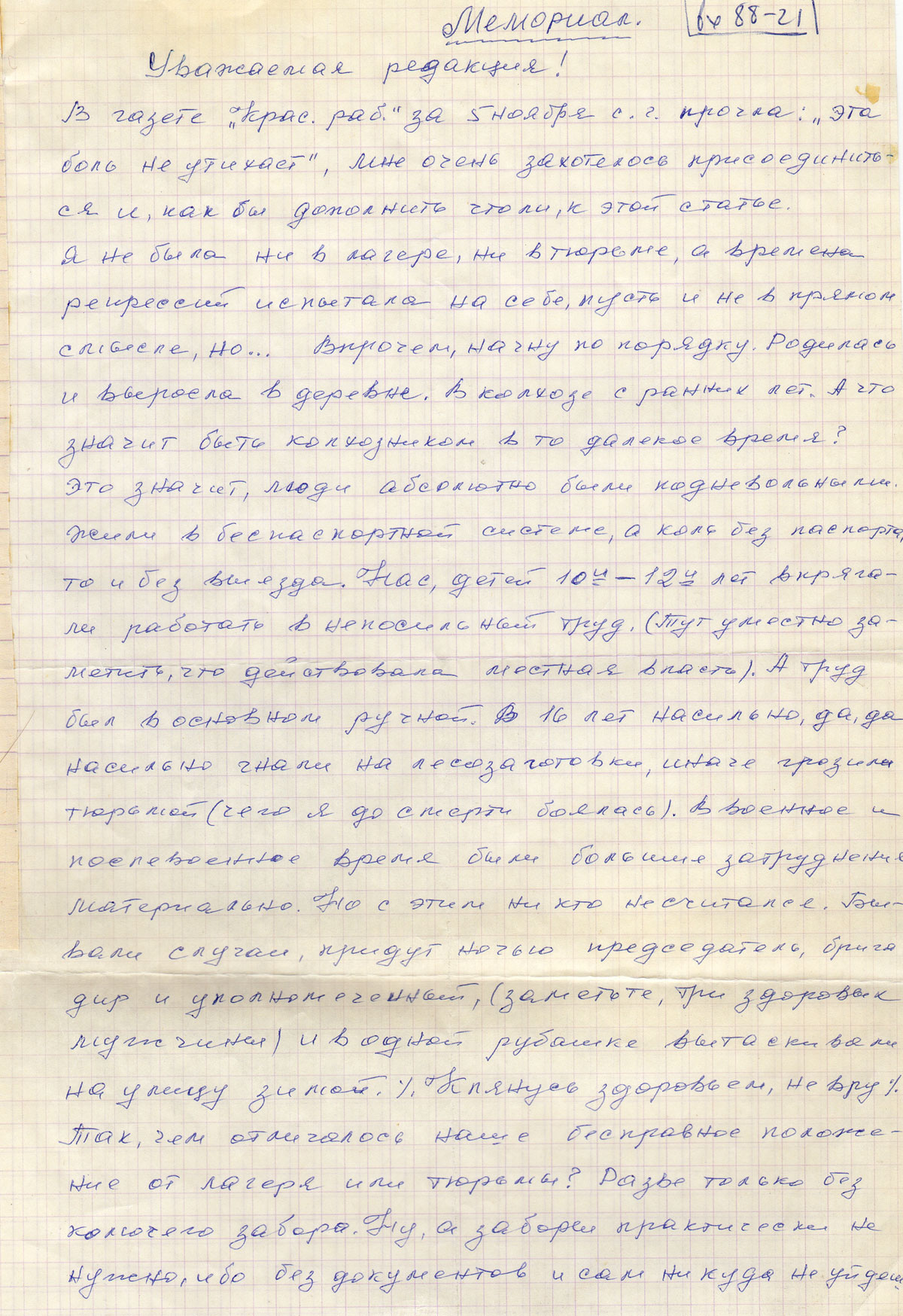 В газете «Крас. рабочий» за 5 ноября с.г. прочла: «эта боль не утихает», мне очень захотелось присоединиться и, как бы дополнить что ли, к этой статье. Я не была ни в лагере, ни в тюрьме, а времена репрессий испытала на себе, пусть и не в прямом смысле, но … Впрочем, начну по порядку. Родилась и выросла в деревне. В колхозе с ранних лет. А что значит быть колхозником в то далекое время? Это значит, люди абсолютно были подневольными. Жили в беспаспортной системе, а коль без паспорта, то и без выезда. Нас, детей 10-ти - 12-ти лет впрягали работать в непосильный труд. (Тут уместно заметить, что действовала местная власть). А труд был в основном ручной. В 16 лет насильно, да, да насильно гнали на лесозаготовки, иначе грозили тюрьмой (чего я до смерти боялась). В военное и послевоенное время были большие затруднения материально. Но с этим никто не считался. Бывали случаи, придут ночью председатель, бригадир и уполномоченный, (заметьте, три здоровых мужчины) и в одной рубашке вытаскивали на улицу зимой. Клянусь здоровьем, не вру. Так, чем отличалось наше бесправное положение от лагеря или тюрьмы? Разве только без колючего забора. Ну, а забора практически не нужно, ибо без документов и сам никуда не уйдешь. Издевательства и унижения одинаковы были. Вот уж поистине боль и обида не утихает. Когда я читаю те строчки, где женщины испытали голод и холод в лагерях, честное слово мне кажется, что я тоже в лагере была, или, как в лагере. В колхозе отработала 18 лет, из них 9 зим на лесозаготовках, почти бесплатно, т.к. на пропитание и одежду приходилось мыть чужие избы и стирать у людей белье. Теперь женщина с 30 летним стажем считается ветераном (кстати в тепле и сыта). У меня тоже в итоге стаж не меньше, а получаю по неполному (34р). А уж о звании ветерана и во сне не смею видеть. Везде и всюду с высоких трибун и в печати пропогандируется о гуманности. Да, где же она, и к кому обращена?