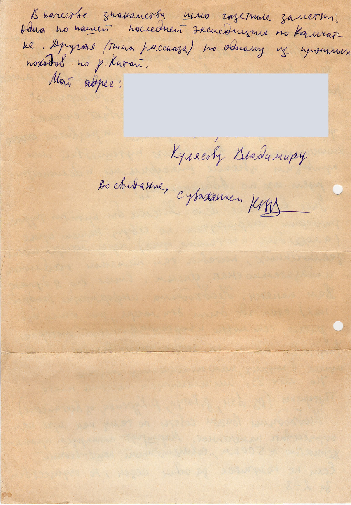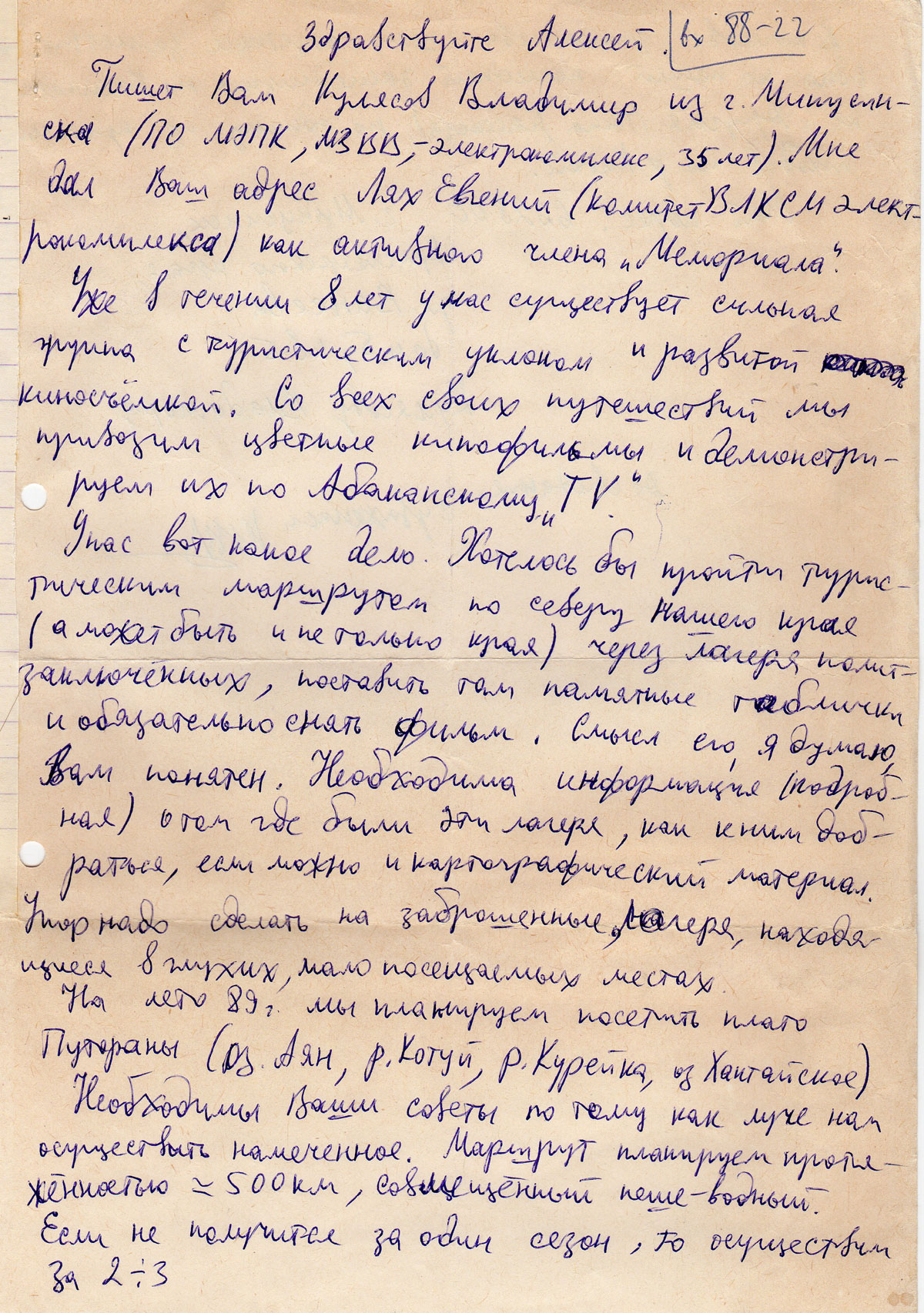 Пишет Вам Кулясов Владимир из г. Минусинска (ПО МЭПК, МВВВ – электрокомплекс, 35 лет). Мне дал Ваш адрес Лях Евгений (комитет ВЛКСМ электрокомплекса) как активного члена «Мемориала». Уже в течении 8 лет у нас существует сильная группа с туристическим уклоном и развитой киносъемкой. Со всех своих путешествий мы привозим цветные кинофильмы и демонстрируем их по Абаканскому «TV».