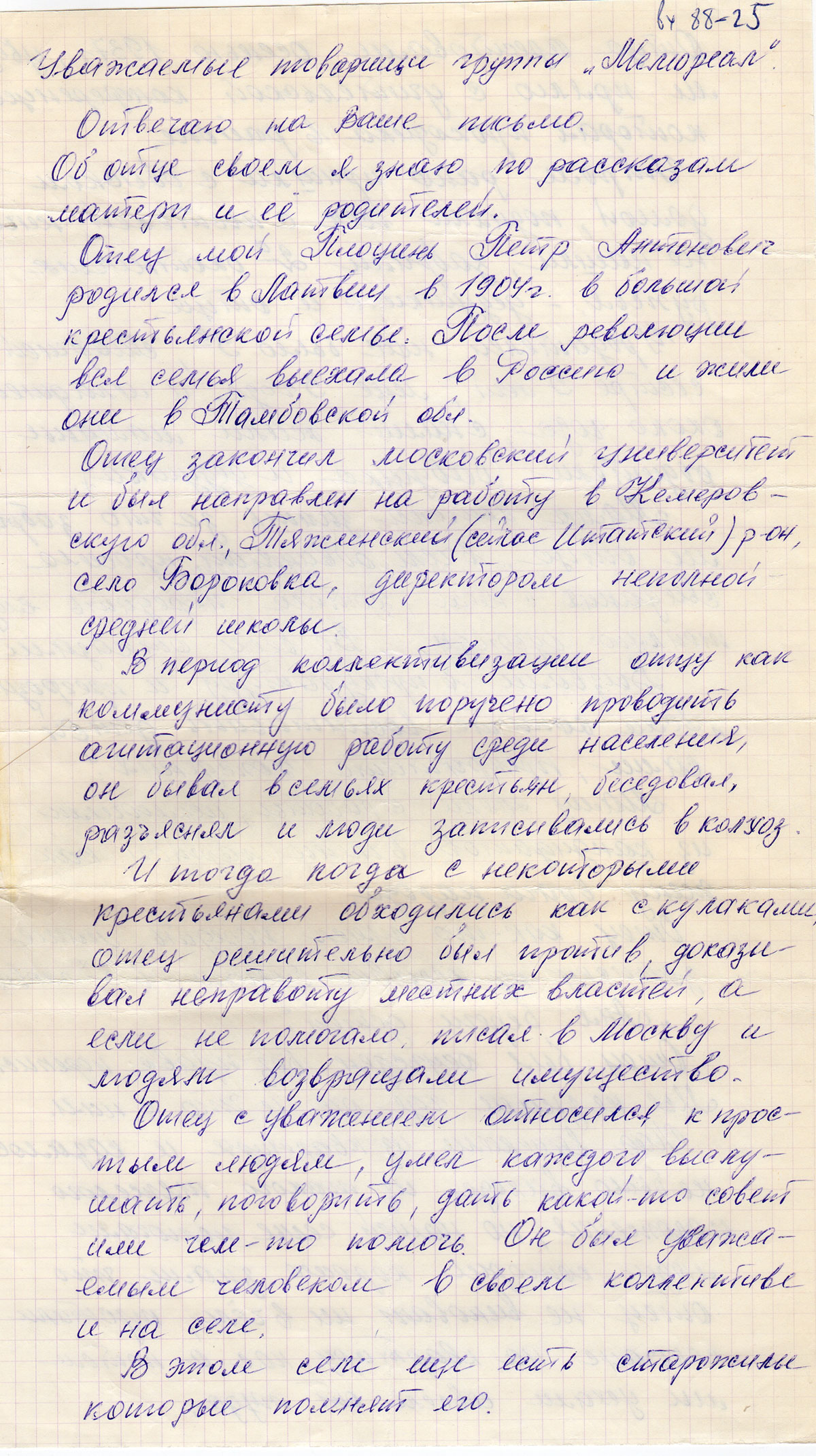 Отец мой Плоцинь Петр Антонович родился в Латвии в 1904 г. в большой крестьянской семье. После революции вся семья выехала в Россию и жили они в Тамбовской обл.