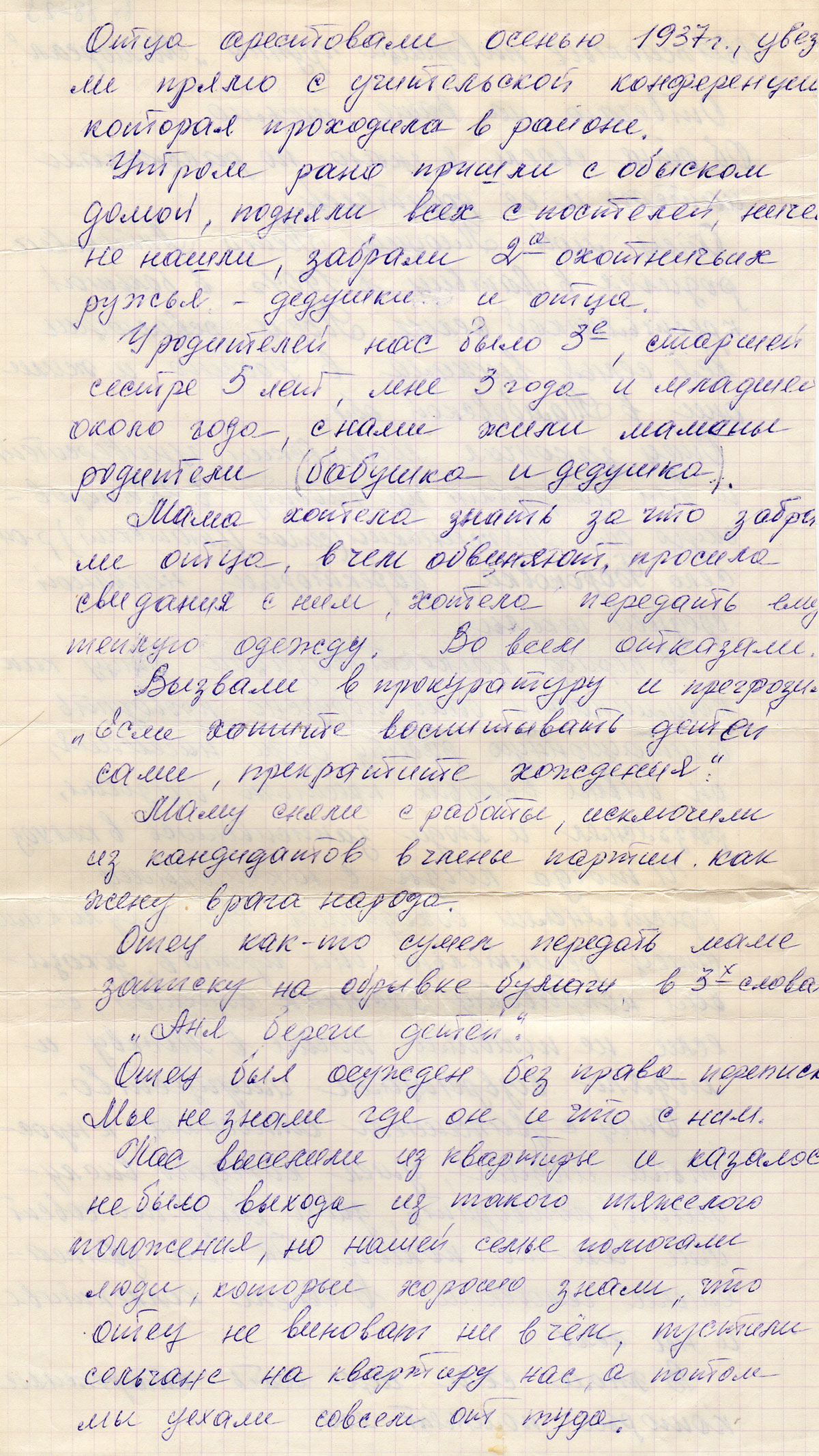 Отца арестовали осенью 1937 г., увезли прямо с учительской конференции которая проходила в районе.