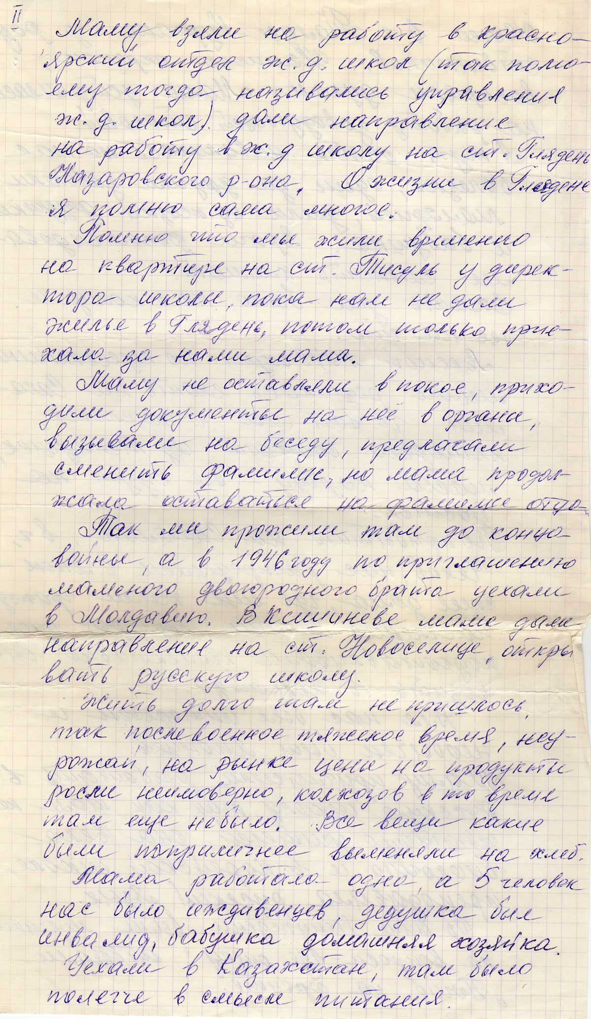 Так мы прожили там до конца войны, а в 1946 году по приглашению маменого двоюродного брата уехали в Молдавию. В Кишиневе маме дали направление на ст. Новоселице, открывать русскую школу.