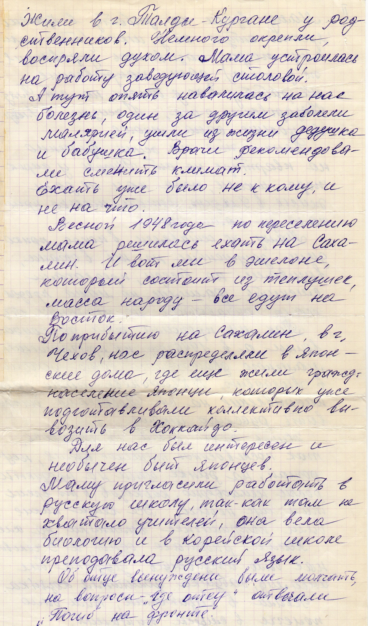 Жили в г. Талды-Кургане у родственников. Немного окрепли, воспряли духом. Мама устроилась на работу заведующей столовой.