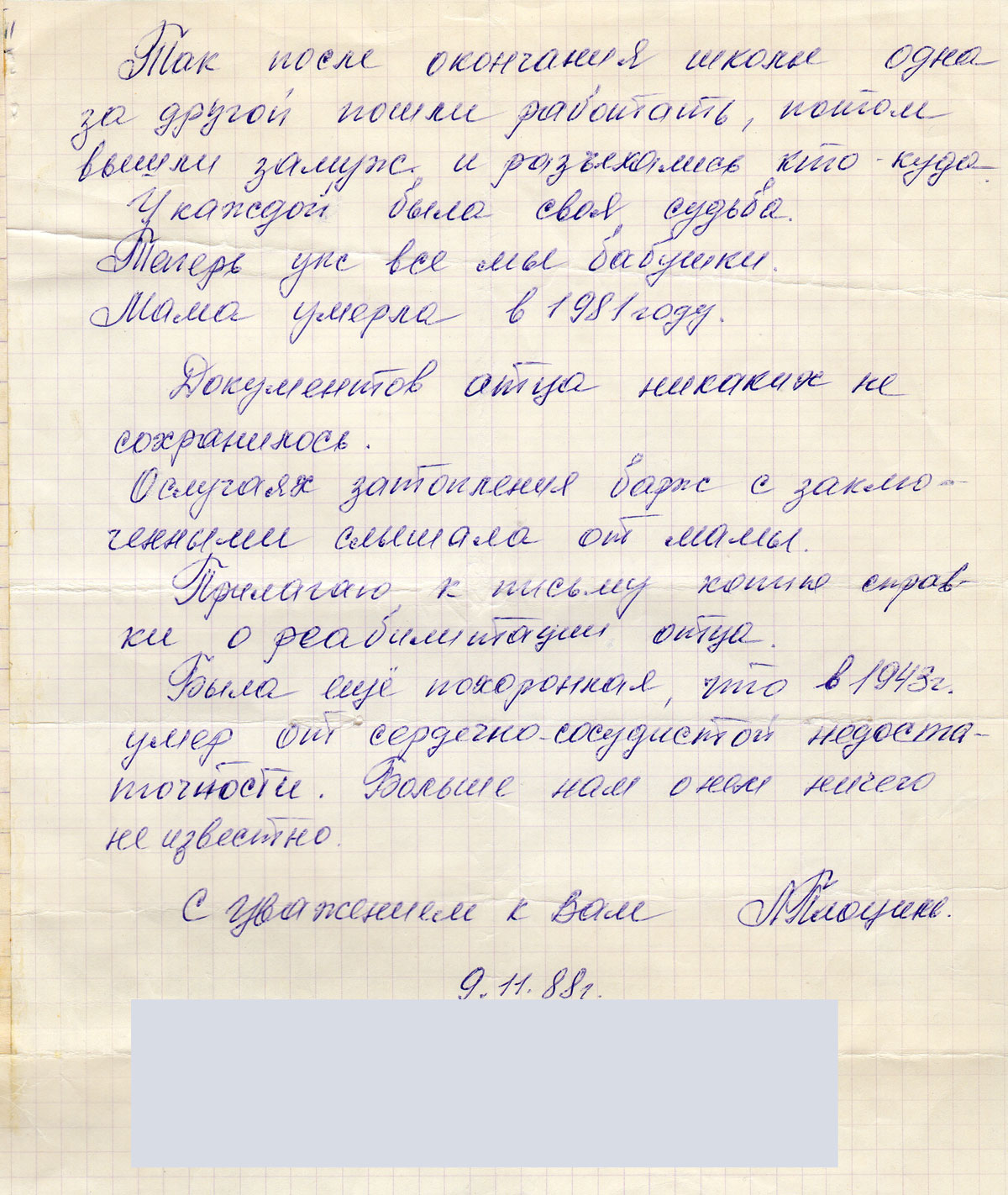 Отец был осужден без права переписки. Мы не знали где он и что с ним.