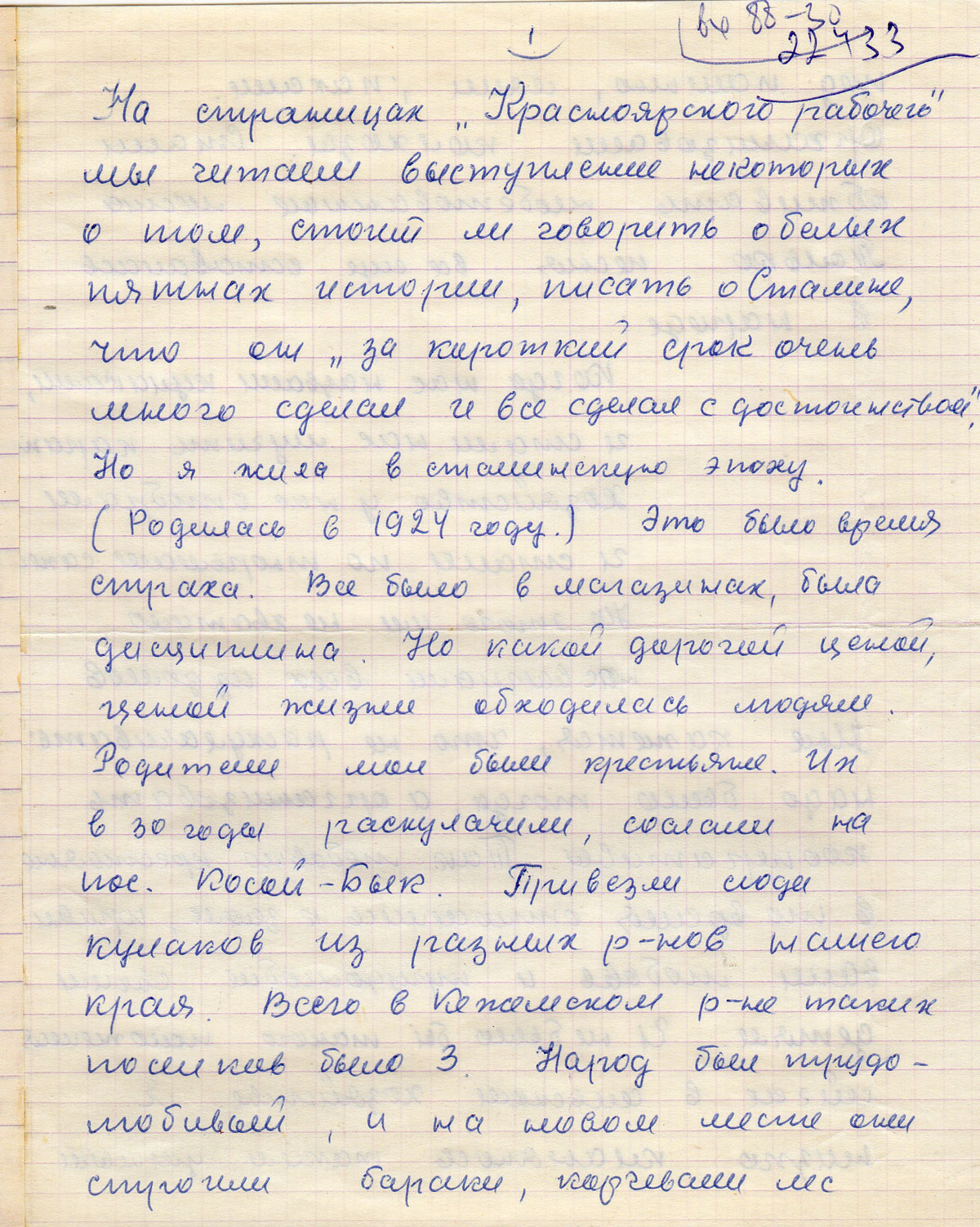 На страницах «Красноярского рабочего» мы читаем выступление некоторых о том, стоит ли говорить о белых пятнах истории, писать о Сталине, что он «за короткий срок очень много сделал и все сделал с достоинством». Но я жила в сталинскую эпоху. (Родилась в 1924 году.) Это было время страха. Все было в магазинах, была дисциплина. Но какой дорогой ценой, ценой жизни обходилась людям. Родители мои были крестьяне. Их в 30 годы раскулачили, сослали на пос. Косой-Бык. Привезли сюда кулаков из разных р-нов нашего края. Всего в Кежемском р-не таких поселков было 3. Народ был трудолюбивый, и на новом месте они строили бараки, корчевали лес под пашню, сеяли; пахали. Организовали колхозы. Стали обживать необетованные места.