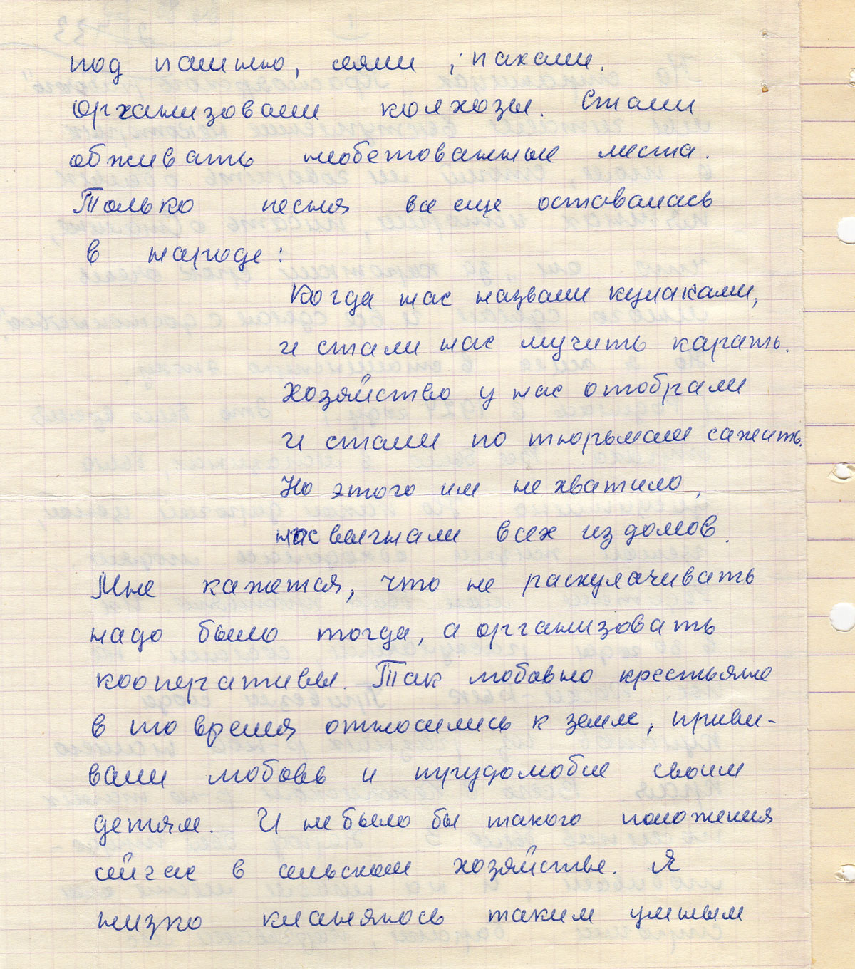 Мне кажется, что не раскулачивать надо было тогда, а организовывать кооперативы. Так любовно крестьяне тогда относились к земле, прививали любовь и трудолюбие своим детям. И не было бы такого положения сейчас в сельском хозяйстве. Я низко кланяюсь таким умным людям, как Н.И. Бухарин, которые, защищая интересы к-н, безвинно пострадали. Сердце замирает, когда мы узнаем о репрессиях Сталина, пытках, издевательствах над нашим народом. И это считают некоторые ошибками.