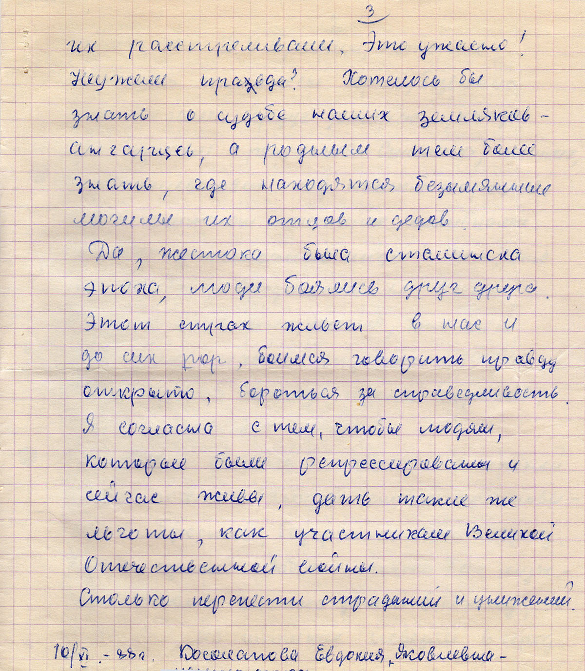 Да, жестока была сталинска эпоха, люди боялись друг друга. Этот страх живет в нас до сих пор, боимся говорить правду открыто, бороться за справедливость.