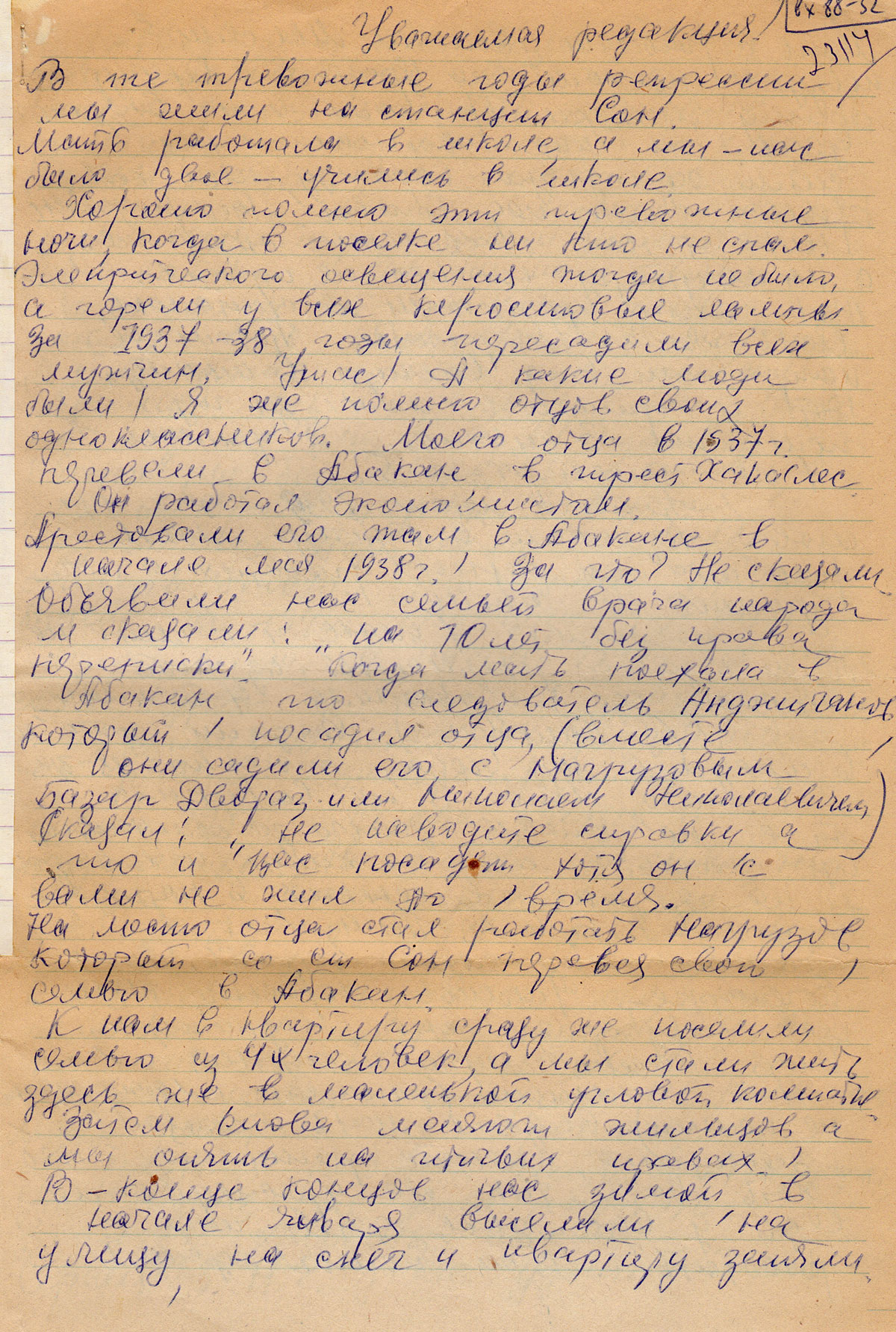 Хорошо помню эти тревожные ночи, когда в поселке никто не спал. Электрического освещения тогда не было, а горели у всех керосиновые лампы. За 1937-1938 годы, пересадили всех мужчин. Ужас! А какие люди были! Я же помню отцов своих одноклассников. Моего отца в 1937 г. перевели в Абакан, в трест Хакаслес.