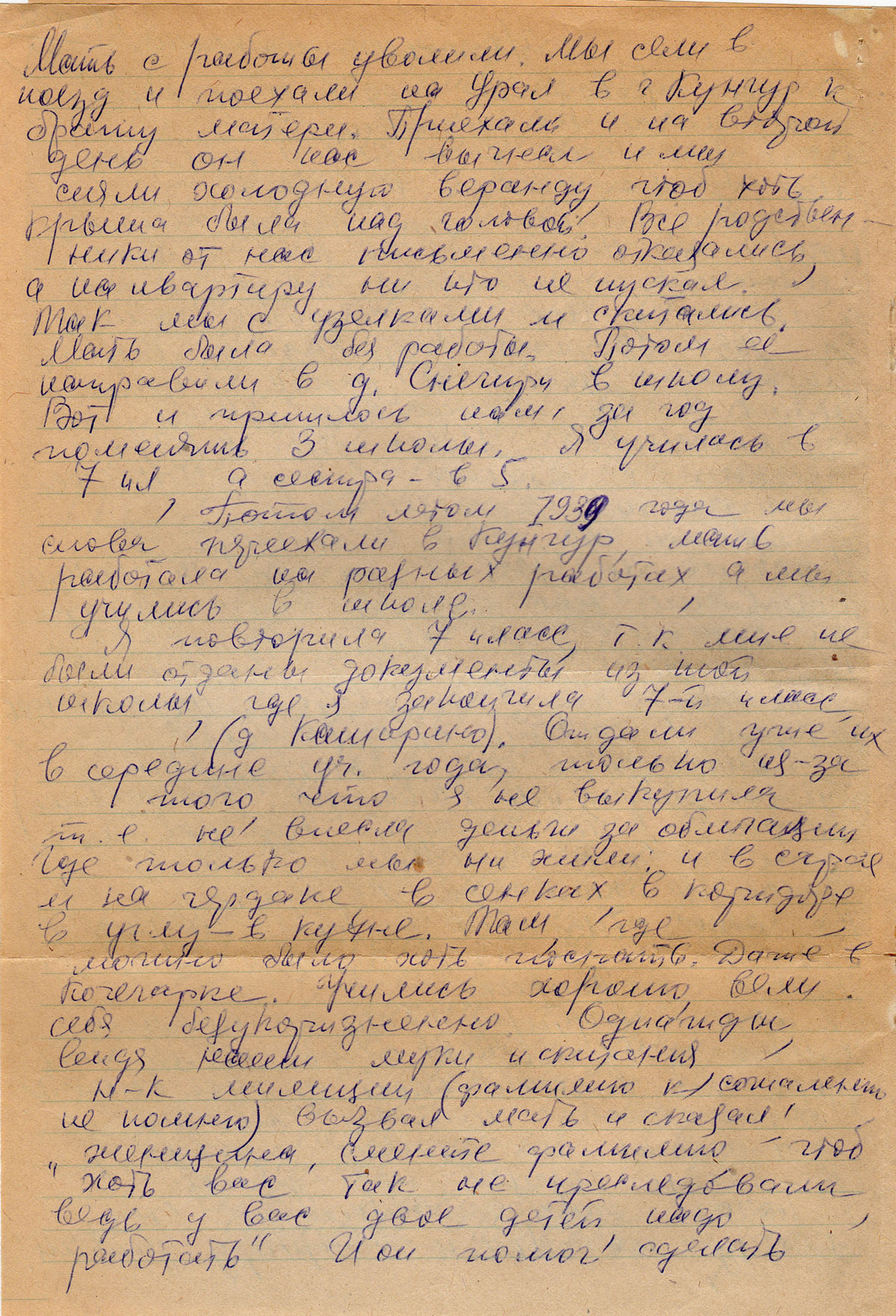 Мать с работы уволили. Мы сели в поезд и поехали на Урал в г. Кунгур к брату матери. Приехали и на второй день он нас выгнал и мы сняли холодную веранду, чтоб хоть крыша была над головой. Все родственники от нас письменно отказались, а на квартиру никто не пускал. Так мы с узелками и скитались. Мать была без работы. Потом ее направили в д. Снегири в школу. Вот и пришлось нам за год поменять 3 школы. Я училась в 7 кл., а сестра – в 5.