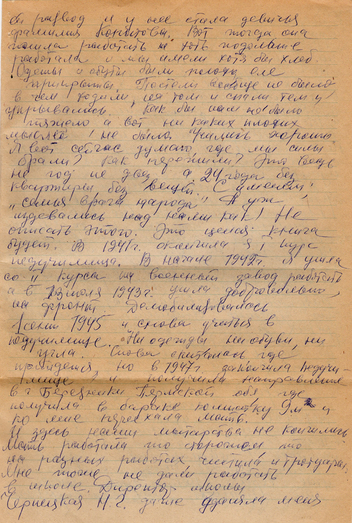 Я повторила 7 класс, т.к. мне небыли отданы документы из той школы, где я закончила 7 класс (д. Каширино). Отдали уже их в середине уч. года, только из-за того, что я не выкупила т.е. не внесла деньги за облигации. Где только мы ни жили: и в сарае, и на чердаке в сенках, в коридоре в углу – в кухне. Там, где можно было хоть поспать. Даже в кочегарке. Учились хорошо, вели себя безукоризненно. Однажды, видя на муки и скитания н-к милиции (фамилию к сожалению не помню) вызвал мать и сказал: «женщина, смените фамилию чтоб хоть вас так не преследовали ведь у вас двое детей, надо работать». И он помог сделать ей развод и у нее стала девичья фамилия Копытова. Вот тогда она пошла работать и хоть подольше работала и мы имели хотя бы хлеб. Одеты и обуты были плохо еле прикрыты. Постели вообще не было, в чем ходили, на том и спали тем и укрывались. Как бы нам не было тяжело, а вот никаких плохих мыслей не было. Учились хорошо. Я вот сейчас думаю, где, мы силы брали? Как пережили? Это ведь не год не два, а 24 года без квартиры, без вещей. С именем: «семья врага народа». А уж издевались над нами как! Не описать этого. Это целая книга будет. В 1941 г. окончила я I курс педучилища. В начале 1942 г. я ушла со II курса на военный завод работать, а 13 июля 1943 г. ушла добровольно, на фронт. Демобилизовалась. 1 сентября 1945 и снова учиться в педучилище. Ни одежды, ни обуви, ни угла. Снова скиталась, где придется, но в 1947 г. закончила педучилище и получила направление в г. Березники Пермской обл., где получила в бараке комнатку 9 м2 и ко мне переехала мать. И здесь наши мытарства не кончились. Мать работала то сторожем, то на разных работах, чистила и тротуары. Мне тоже не дали работать в школе. Директор школы Чернецкая Н.Г. даже удаляла меня с торжественных собраний, как дочь врага народа. Унижали, как могли. Но все же год я доработала. Ходили на уроки ко мне ежедневно и всё искали, не допущу ли я оплошности в своих уроках. Вела я 4-й класс в мужской школе. Ежедневно или директор, или завуч, или инспектор, или сама зав. гороно. Однако никаких замечаний не было ни к чему не могли придраться. А что стоило мне всё это! Какая силища нужна была? А воля?