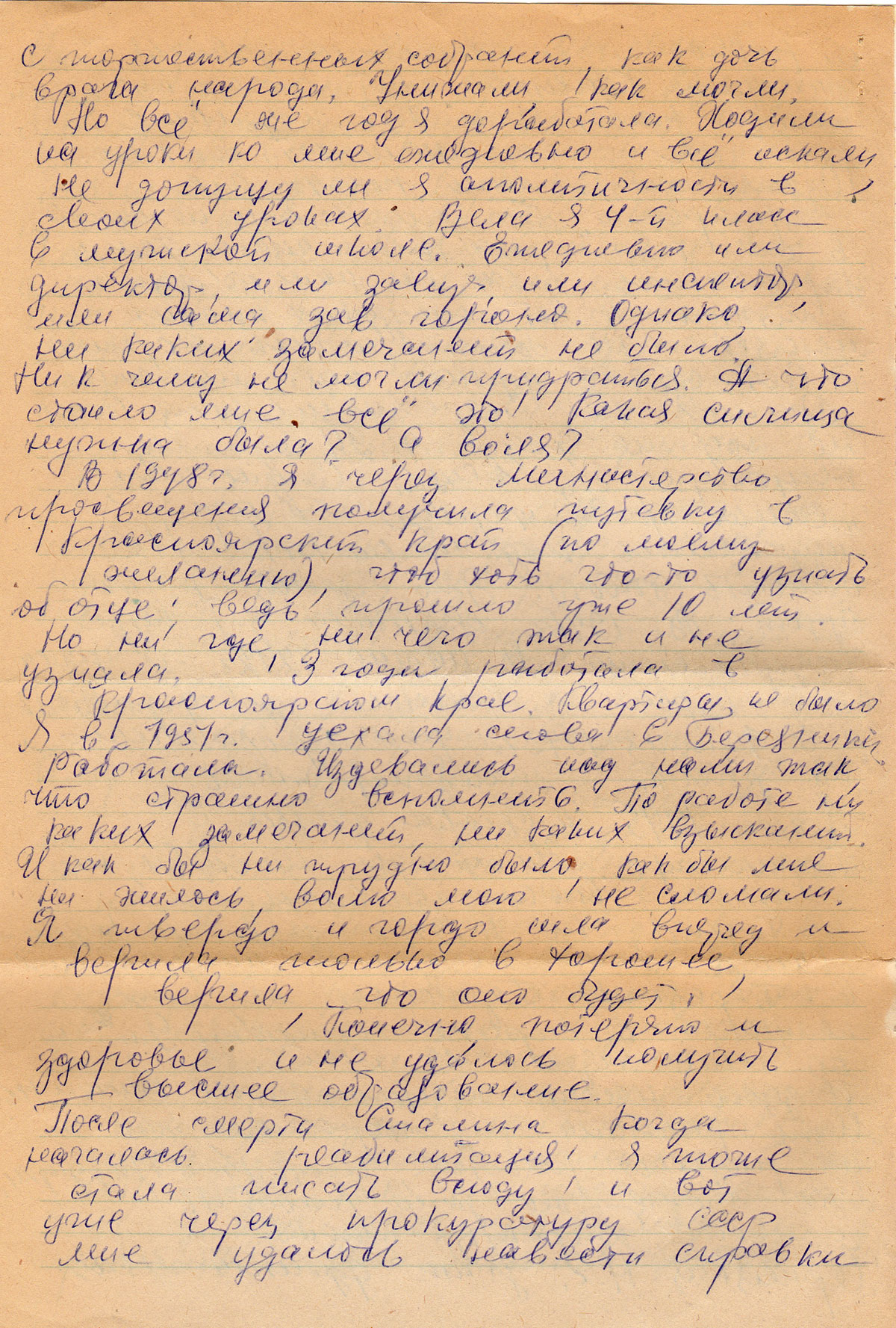В 1948 г. я через Министерство просвещения получила путевку в Красноярский край (по моему желанию), чтоб хоть что-то узнать об отце, ведь прошло уже 10 лет. Но ни где, ничего так и не узнала. 3 года работала в Красноярском крае. Квартиры не было. Я в 1951 г. уехала снова в Березники. Работала. Издевались над нами так, что страшно вспоминать. По работе ни каких замечаний, ни каких взысканий. И как бы ни трудно было, как бы мне ни жилось, волю мою не сломали. Я твердо и гордо шла вперед и верила только в хорошее, верила, что оно будет.