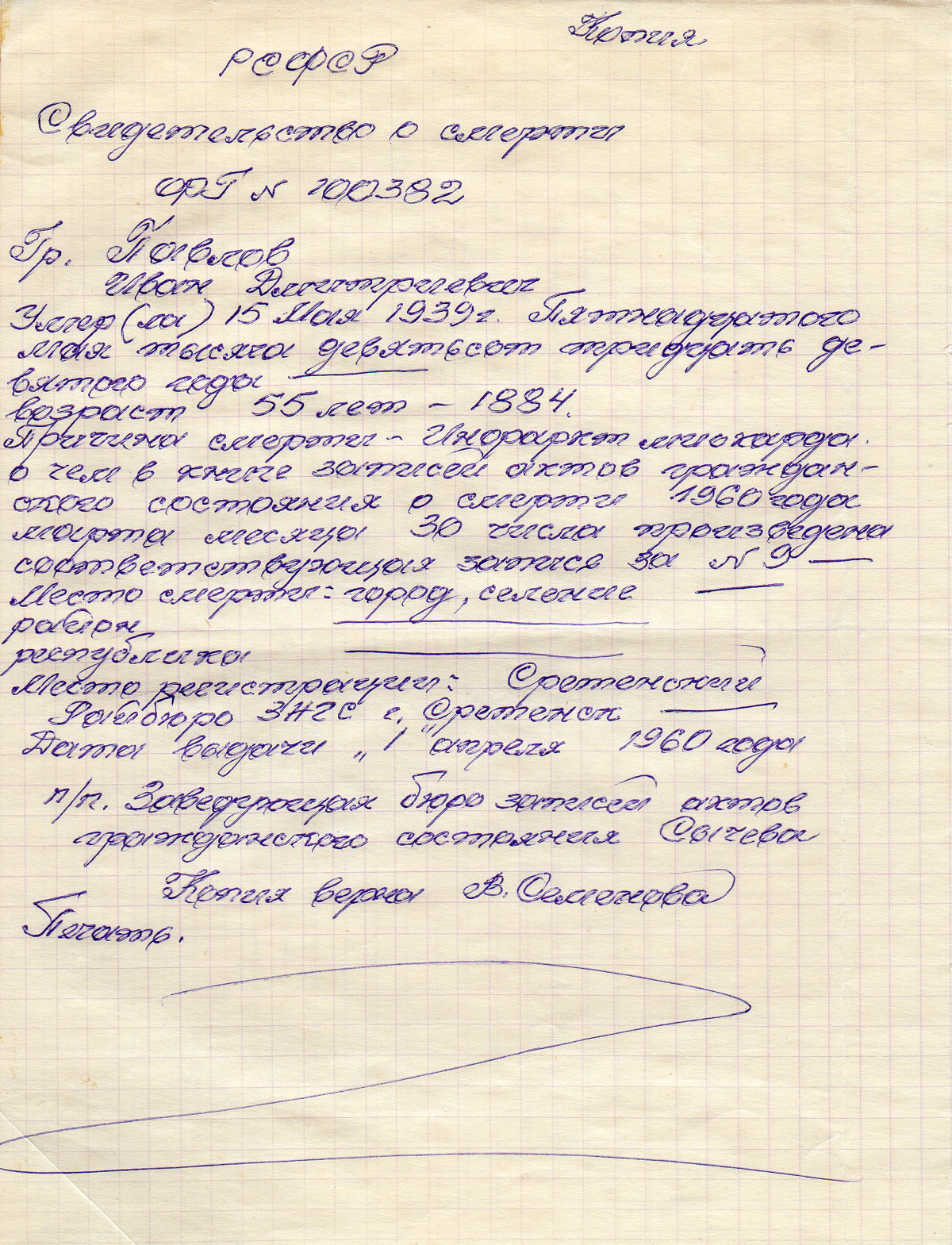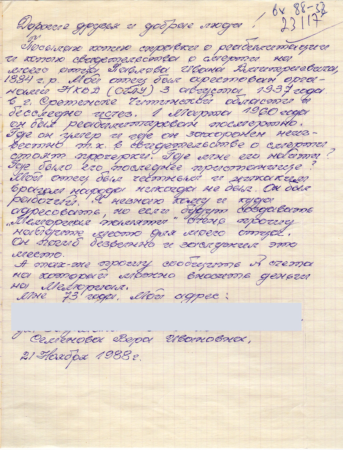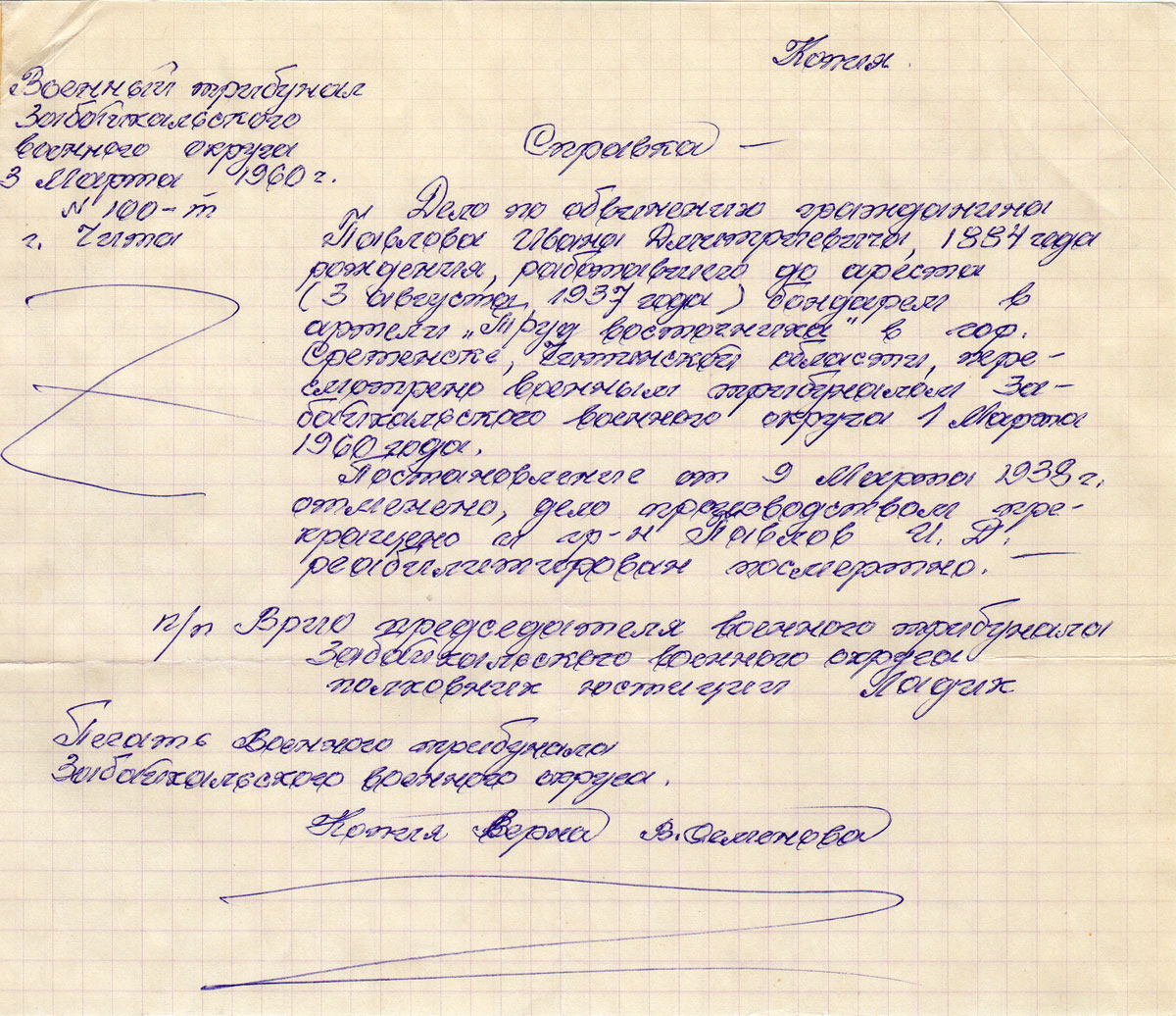 Посылаю копию справки о реабилитации и копию свидетельства о смерти на моего отца Павлова Ивана Дмитриевича, 1884 г.р. Мой отец был арестован органами НКВД (ОГПУ) 3 августа 1937 года в г. Сретенске Читинской области и бесследно исчез.