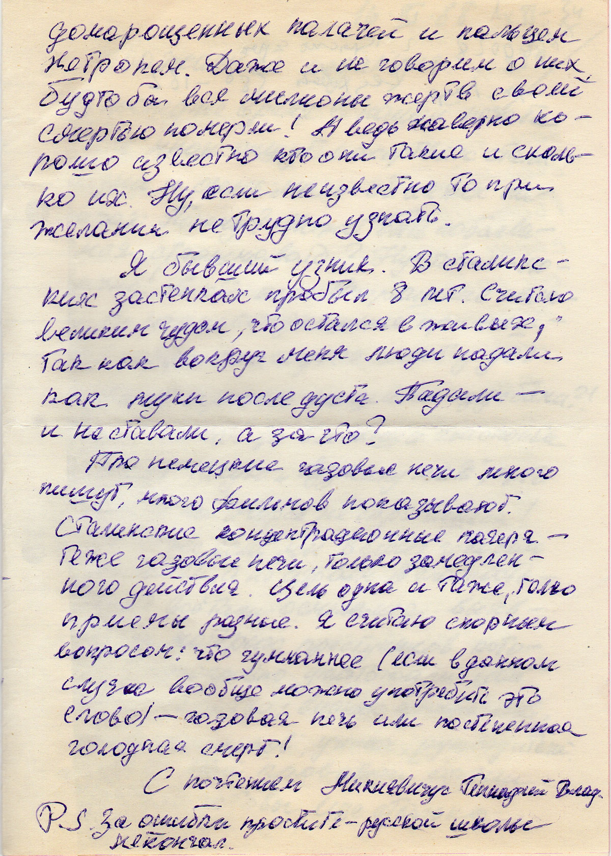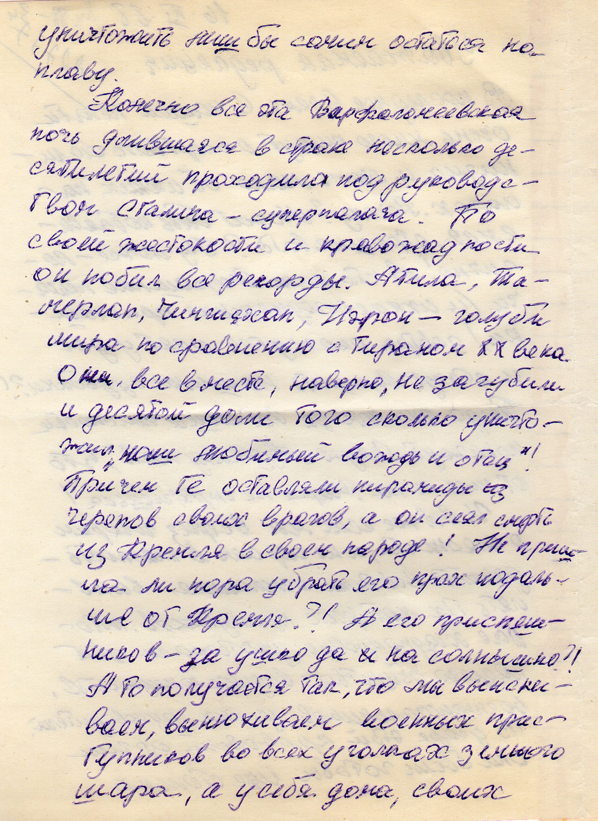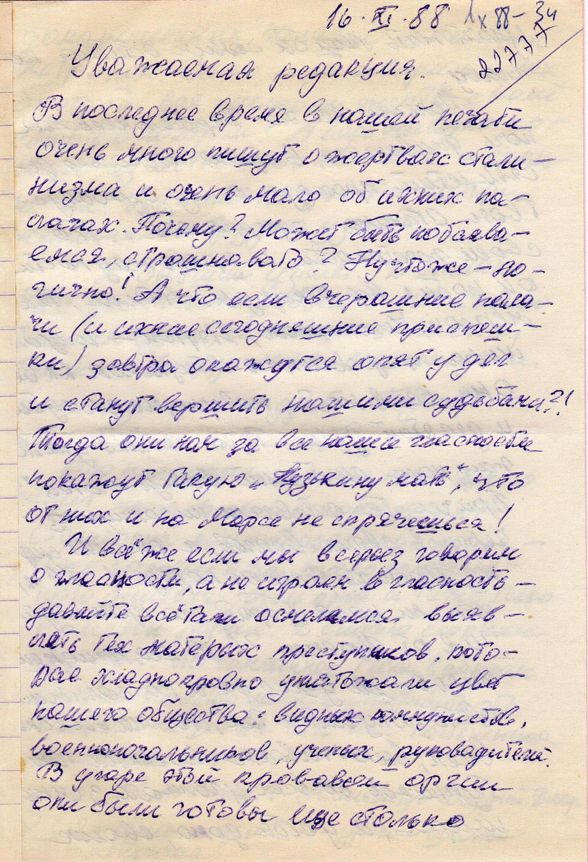 И всё же если мы всерьез говорим о гласности, а не играем в гласность – давайте всё таки осмелимся выявлять тех матерых преступников, которые хладнокровно уничтожали цвет нашего общества: видных коммунистов, военноначальников, ученых, руководителей. В угаре этой кровавой оргии они были готовы еще столько уничтожать лиш бы самим остаться на плаву.
