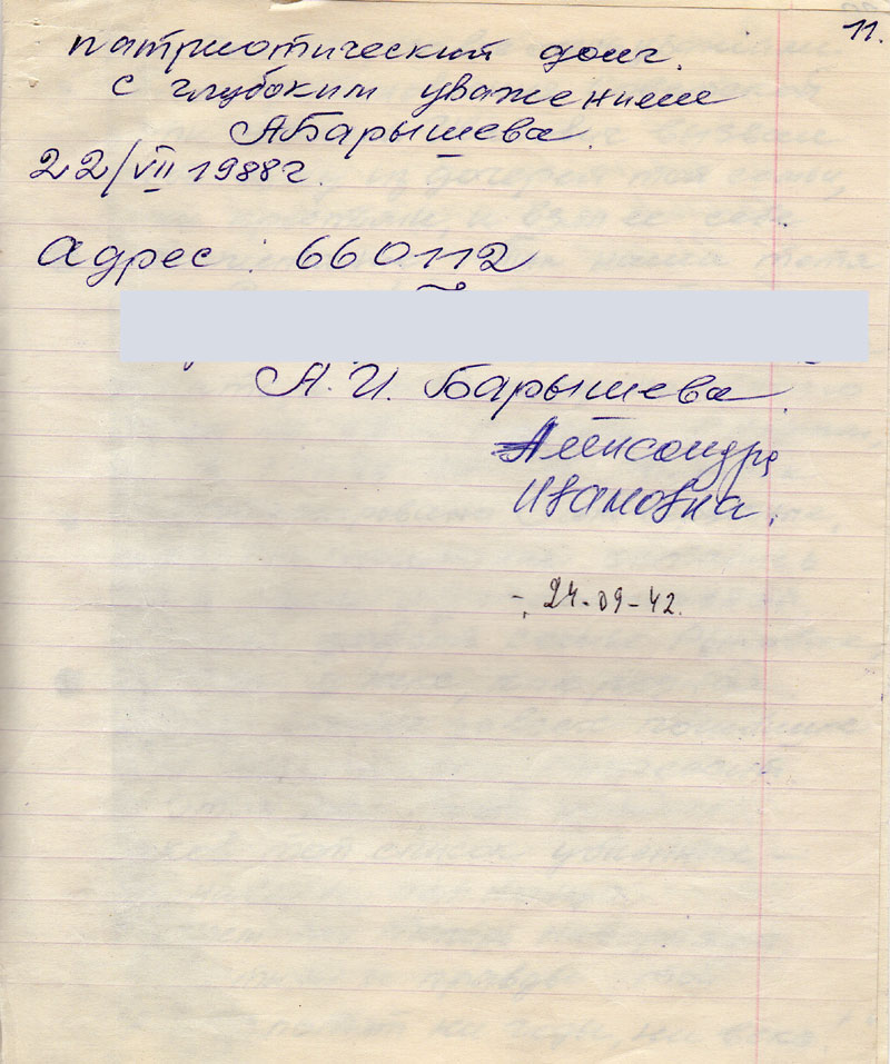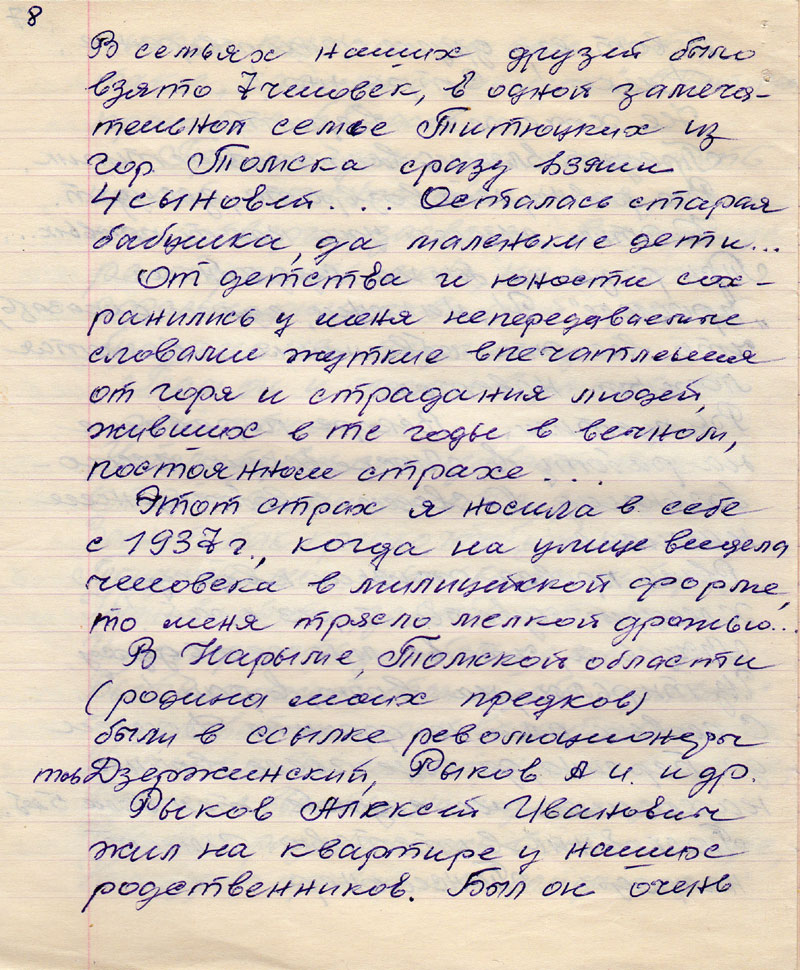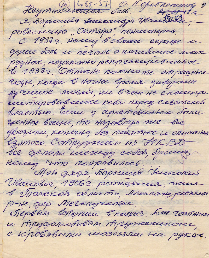 С 1937 г. ношу в своем сердце и душе боль и печаль о погибших моих родных, незаконно репрессированных в 1937г. Отлично помню те страшные годы, когда в ночное время забирали лучших людей, ни в чем не скомпрометировавших себя перед советской властью. Если у арестованных были ценные вещи, то назавтра же все увозили, конечно, без понятых и описания взятого. Сотрудники из НКВД все делили между собой, брали кому что понравилось.