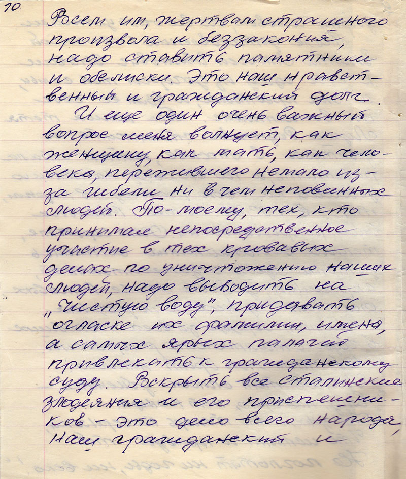 От детства и юности сохранились у меня непередаваемые словами жуткие впечатления от горя и страдания людей, живших в те годы в вечном, постоянном страхе...