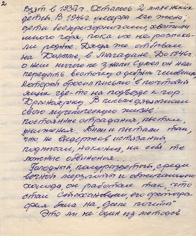 Первым вступил в колхоз. Был честным и трудолюбивым тружеником, с кровавыми мозолями на руках. Взят в 1937 г. Осталось 2 маленьких детей. В 1946 г. умерла его жена; дети беспризорничали, хватили много горя, пока их не разыскали родные. Дядя же отбывал на Колыме, в Магадане. До 1946 г. о нем ничего не знали. Сумел он нам передать весточку с добрым человеком, который бросил письмо в почтовый ящик где-то на подъезде к гор. Красноярску. В письме дядя описал свою мученическую жизнь: постоянные страдания, пытки, унижения. Били и пытали так, что не выдержав истязаний, подписал, наконец, на себя те ложные обвинения...