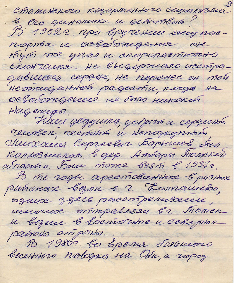 Наш дедушка, добрый и сердечный человек, честный и неподкупный, Михаил Сергеевич Барышев был колхозником в дер. Амбары Томской области. Был тоже взят в 1937 г. В те годы арестованных в разных районах везли в г. Колпашево, одних здесь расстреливали, многих отправляли в г. Томск и везли в восточные и северные районы страны...
