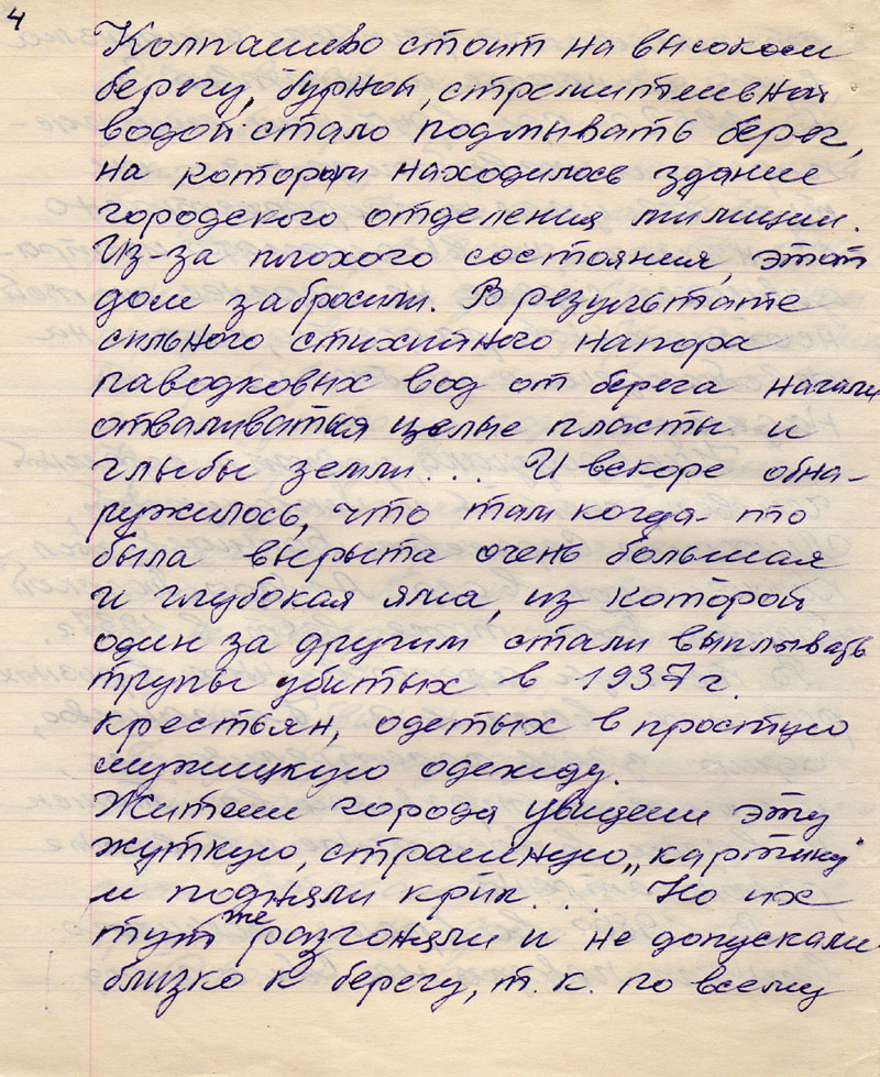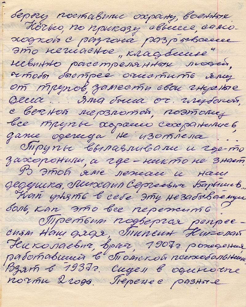 Жители города увидели эту жуткую, страшную «картину» и подняли крик... Но их тут же разогнали и не допускали близко к берегу, т.к. по всему берегу поставили охрану, военных. Ночью, по приказу свыше, самоходкой с разгона разрывали это негласное «кладбище» невинно расстрелянных людей, чтобы быстрее очистить яму от трупов, замести свои гнусные дела... Яма была оч. глубокой, с вечной мерзлотой, поэтому все трупы хорошо сохранились, даже одежда не изотлела... Трупы вылавливали и где-то захоронили, а где - никто не знает. В этой яме лежал и наш дедушка, Михаил Сергеевич Барышев...Как унять в себе эту незабываемую боль, как это все пережить?