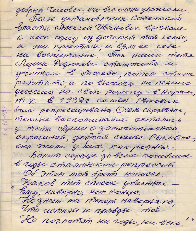 Рыков Алексей Иванович жил на квартире у наших родственников. Был он очень добрый человек, его все очень уважали. После установления Советской власти Алексей Иванович вызвал к себе одну из дочерей той семьи, а они крестьяне, и взял ее себе на воспитание. Так наша тетя Луша Родюкова стала жить и учиться в Москве, потом стала работать, а по выходу на пенсию уехала на свою родину - в Нарым, т.к. в 1937 г. семья Рыковых была репрессирована. Очень сердечные, теплые воспоминания остались у тети Луши о замечательной, скромной, доброй семье Рыковых, она жила у них, как родная.
