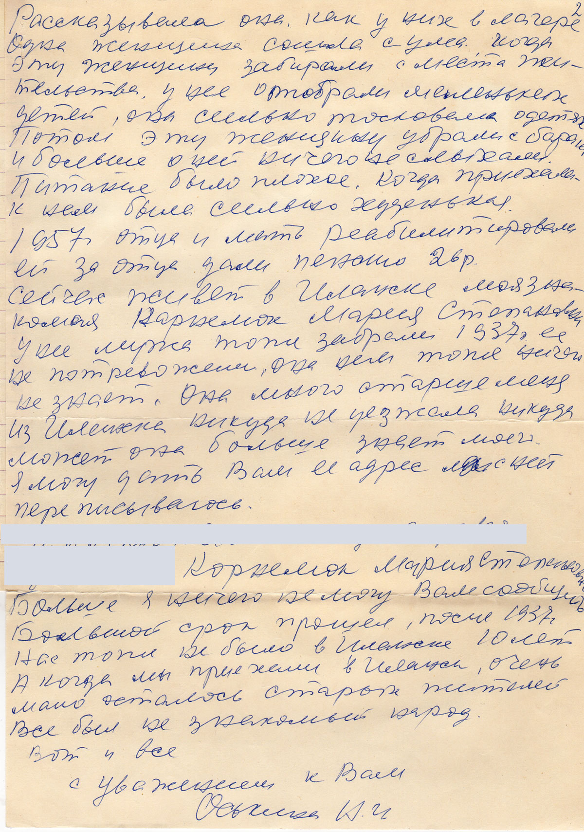 Больше я ничего не могу Вам сообщить. Большой срок прошел, после 1937 г. нас тоже не было в Иланске 10 лет А когда мы приехали в Иланск, очень мало осталось старых жителей Все был не знакомый народ.