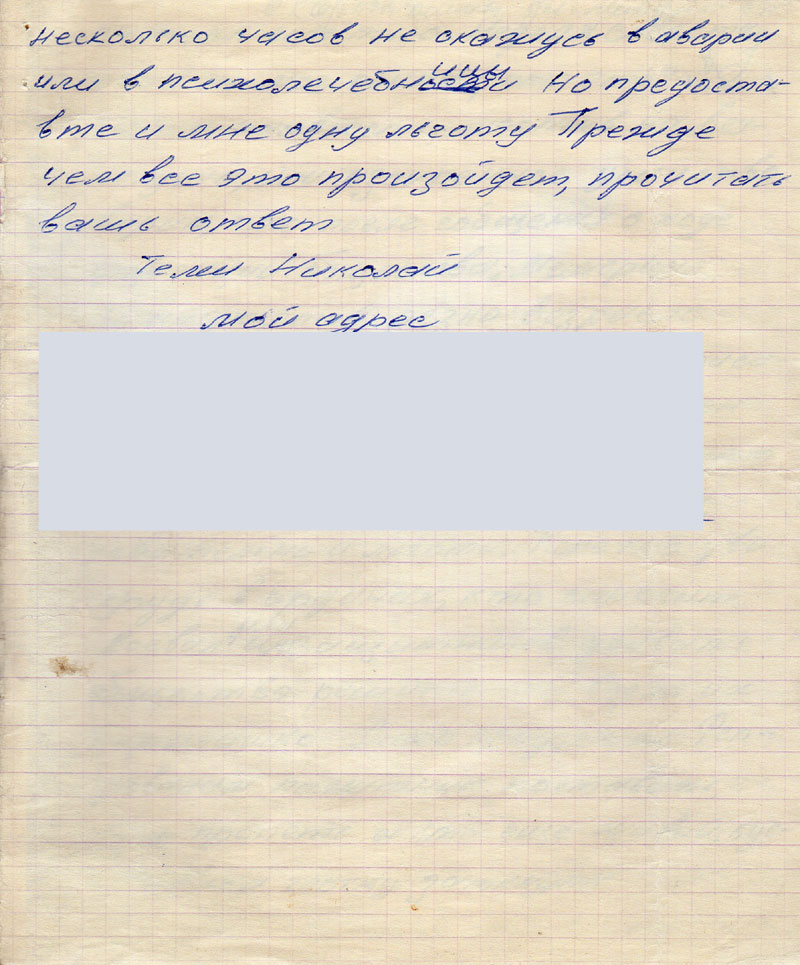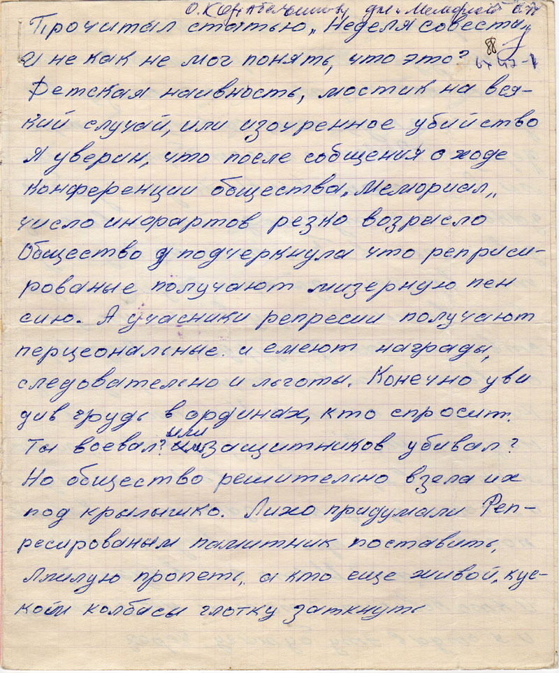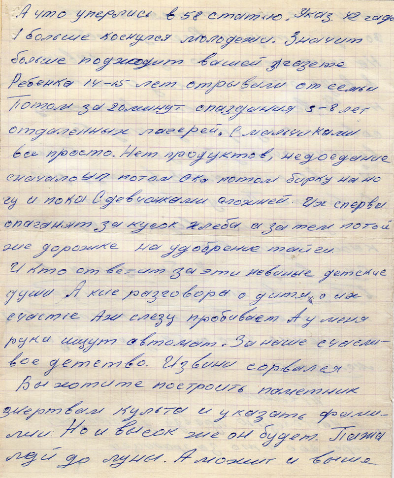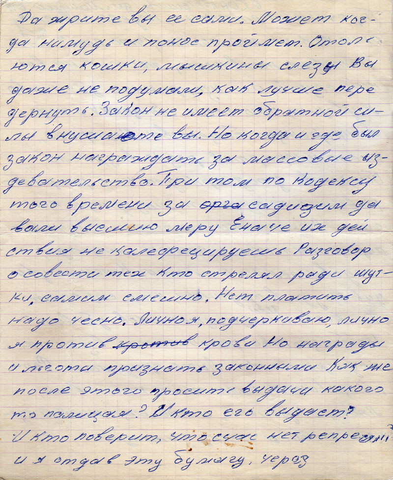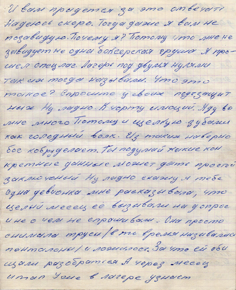 И вам придется за это отвечать Надеюсь скоро. Тогда даже я вам не позавидую. Почему я? Потому что мне не завидует не одна боксерская груша Я прошел спецлаг. Лагерь под двумя нулями так их тогда называли. Что это такое? Спросите у своих подъзащитных. Ну ладно. К чорту эмоций. Яду во мне много Потому и щелкую зубами как голодный волк. Из таких наверно бог кобру делает. Ты подумай какие конкретные данные может дать простой заключоный Ну ладно скажу я тебе Одна девчонка мне расказывала, что целый месец ее вызывали на допрос и не о чем не спрашивали. Она просто снимала трусы (в то время назывались панталоны) и ложилась. За что ей обищали разобраться. А через месец итап Уже в лагере узнает 58 19 прямая измена 10-8 и 5 плюс должен родится ребенок, (оборт только во сне) которому в утробе уже преднозначено быть вором или проституткой За что? И бог наверно не знает. Но кто это подтвердит Она наверника умерла от такова не цветут. Допустим жива придем мы к ней Она плюнет мне в лицо и скажит мусор поганый и все будет отрицать. Она права. Я имею право только на свою жизнь Нужны гарантии, чтоб люди не боялись правды. Апять допустим она подтвердит но где сведители я не чего не видел. А забеременеть она могла еще на свободе на прогулке Нет мальчики умели работать.