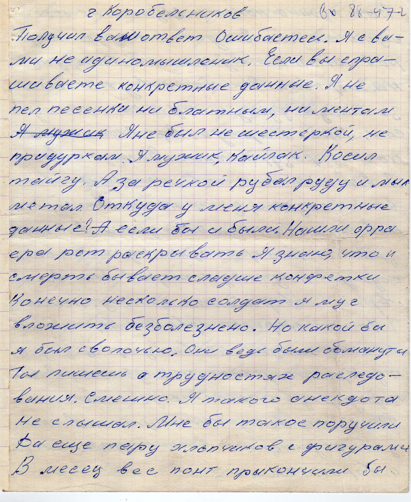 Получил ваш ответ Ошибаетесь. Я с вами не единомышеник. Если вы спрашиваете конкретные данные. Я не пел песенки ни блатным, ни ментам. Я мужик. Я не был не шестеркой, не придуркам. Я мужик, кайлак. Косил тайгу. А за речкой рубал руду и мыметал. Откуда у меня конкретные данные? А если бы и были. Нашли фраера рот раскрывать. Я знаю, что и смерть бывает сладше конфетки Конечно несколько солдат я мог вложить безболезнено. Но какой бы я был сволочью. Они ведь были обмануты Ты пишешь о трудностях раследования. Смешно. Я такого анекдота не слышал. Мне бы такое поручили Да еще пару хлопчиков с фигурами В месец вес понт прикончили бы