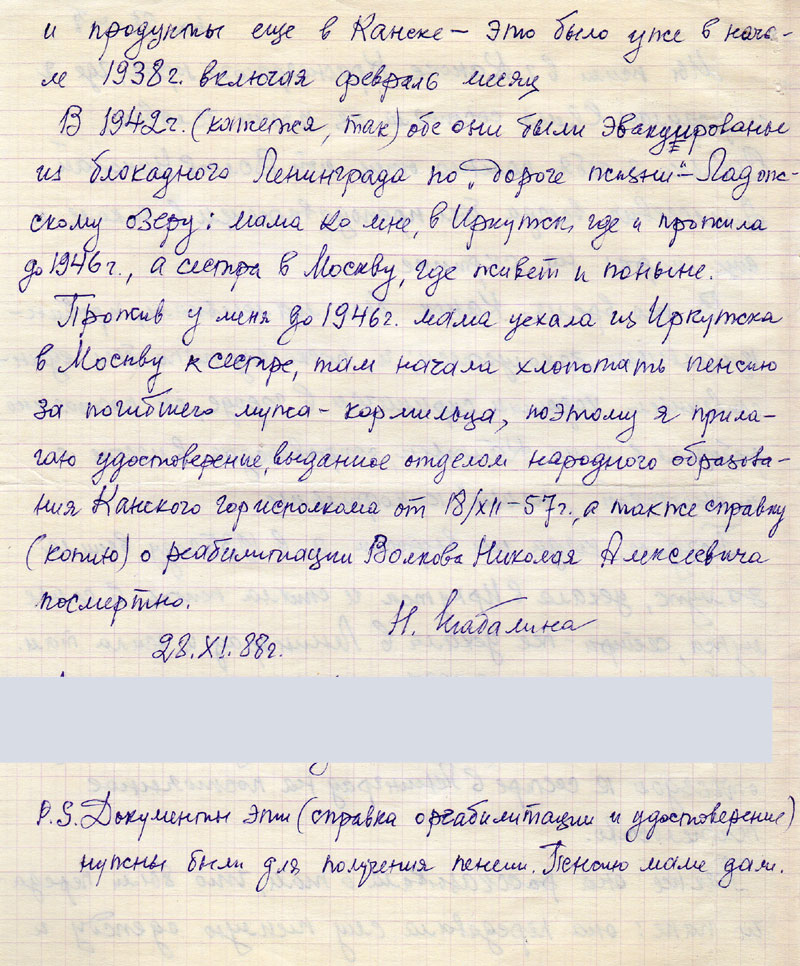 Прожив у меня до 1946 г. мама уехала из Иркутска в Москву к сестре, где начала хлопотать пенсию за погибшего мужа - кормильца, поэтому я прилагаю удостоверение, выданное отделом народного образования Канского горисполкома от 18/12-57г., а так же справку (копию) о реабилитации Волкова Николая Алексеевича посмертно.