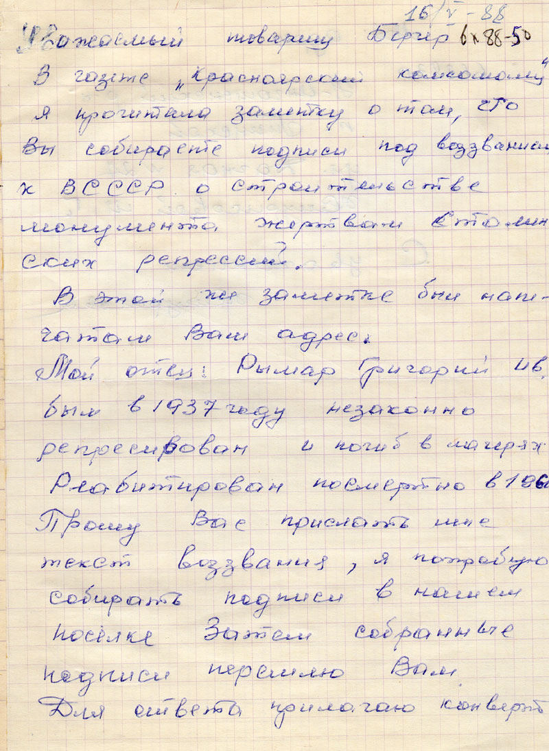 В газете «Красноярский комсомолец» я прочитала заметку о том, что Вы собираете подписи под воззванием к ВСССР о строительстве монумента жертвам Сталинских репрессий.