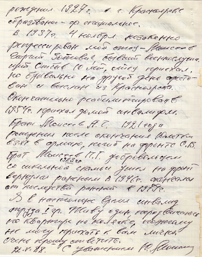 В 1937г. 4 ноября незаконно репрессирован мой отец - Моисеев Георгий Зотович, бывший военнослужащий. Отбыв 10 лет, отец приехал. Но буквально на другой день арестован и выслан из Красноярска. Окончательно реабилитирован в 1954 г. приехал домой инвалидом.