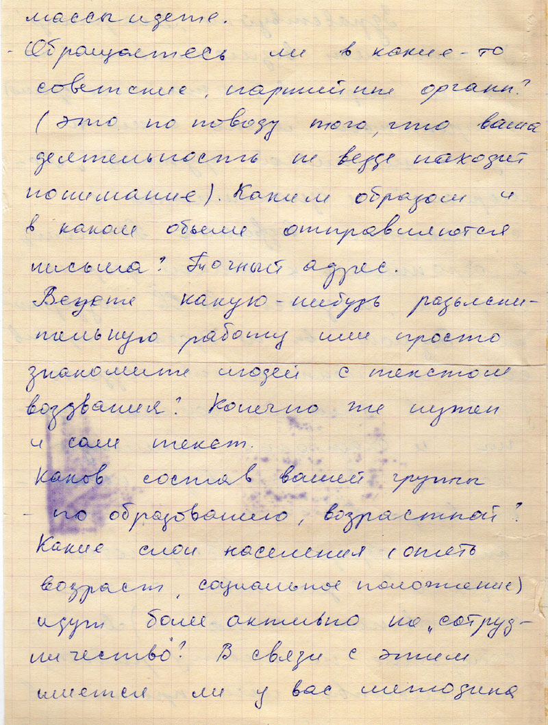 Обращаетесь ли вы в какие-то советские, партийные органы? (это по поводу того, что ваша деятельность не везде находит понимание). Каким образом и в каком объёме отправляются письма? Точный адрес.
