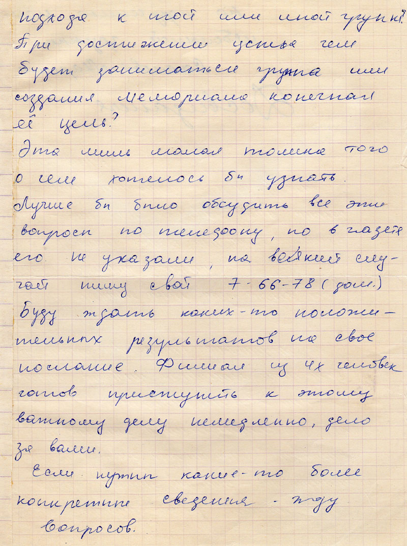 У меня нет возможности (по крайней мере в ближайшее время) встретиться лично с кем-то из инициативной группой «Мемориала» и ознакомиться с текстом воззвания. Поэтому я обратилась к такой форме общения, надеюсь вы ее поддержите. Думаю, вы не будете против, если мы попытаемся создать у себя в г. Ачинске филиал группы и оказывать посильную помощь. В этой связи несколько вопросов.