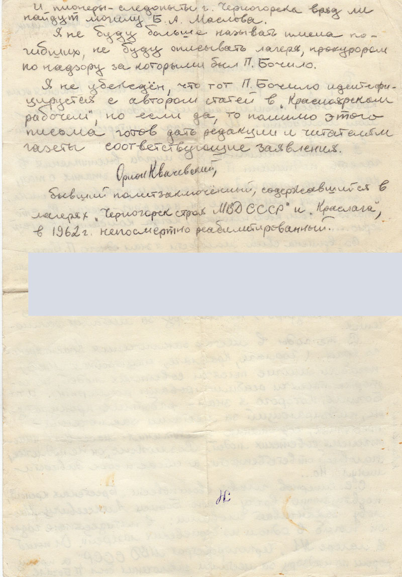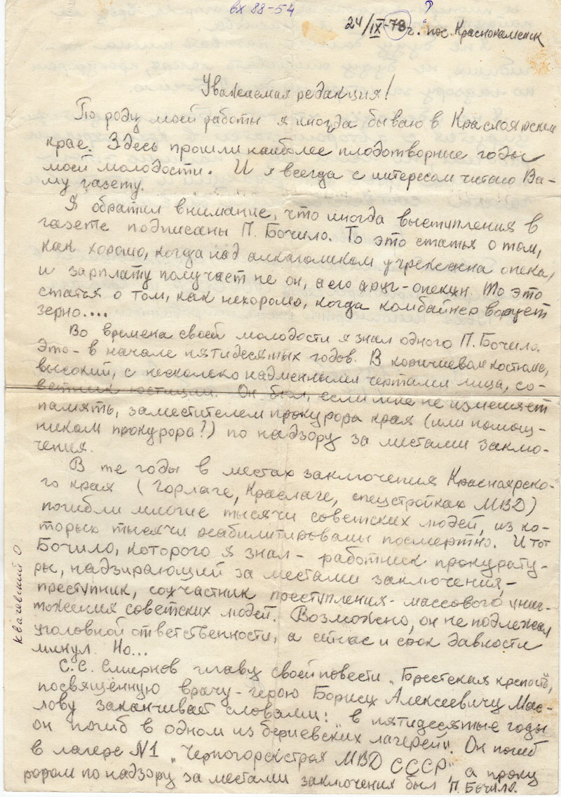 Я не убежден, что тот П. Бочило идентифицируется с автором статей в «Красноярском рабочем», но если да, то помимо этого письма готов дать редакции и читателям газеты соответствующие заявления.