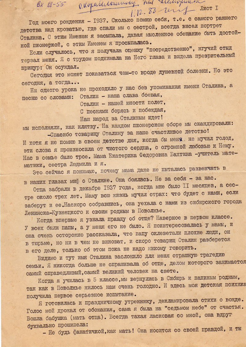 Год моего рождения – 1937. Сколько помню себя, т.е. с самого раннего детства над кроватью, где спали мы с сестрой, всегда висел портрет Сталина. С этим Именем я засыпала, давая мысленное обещание быть достойной пионеркой, с этим Именем я просыпалась.