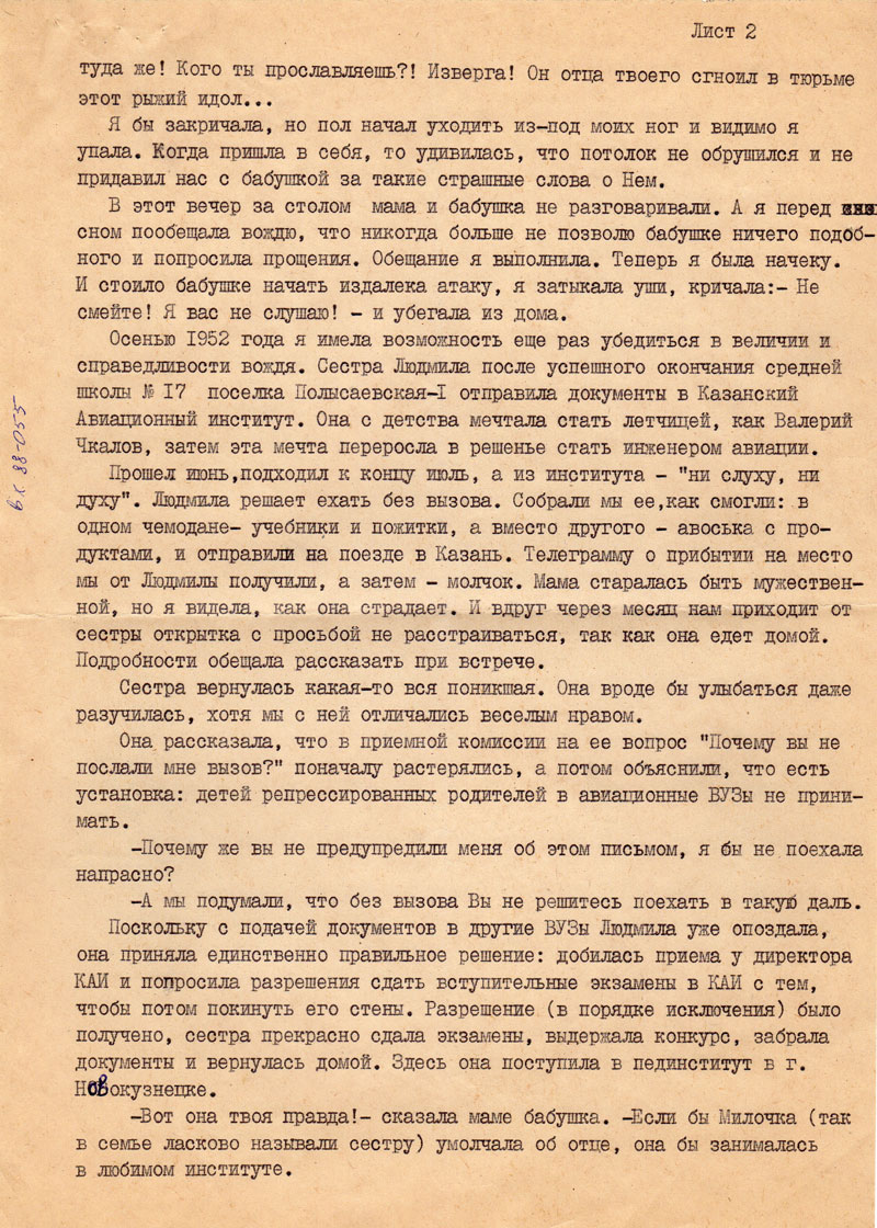 Осенью 1952 года я имела возможность ещё раз убедиться в величии и справедливости вождя. Сестра Людмила после успешного окончания средней школы № 17 посёлка Полысаевская-I отправила документы в Казанский Авиационный институт. Она с детства мечтала стать летчицей, как Валерий Чкалов, затем эта мечта переросла в решенье стать инженером авиации.