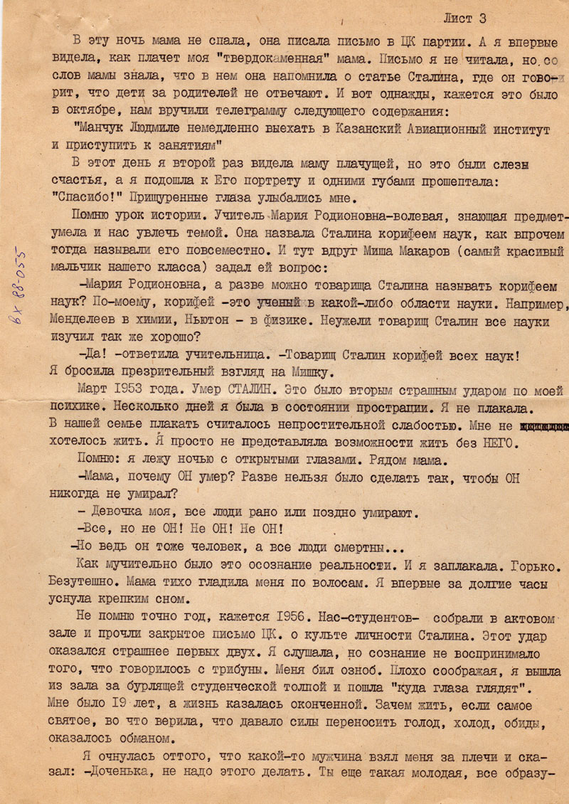 Март 1953 года. Умер СТАЛИН. Это было вторым страшным ударом по моей психике. Несколько дней я была в состоянии прострации. Я не плакала. В нашей семье плакать считалось непростительной слабостью. Мне не хотелось жить. Я просто не представляла возможности жить без НЕГО.