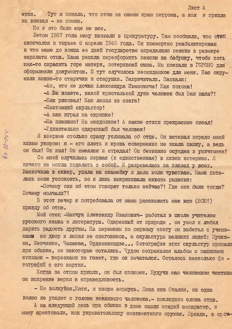 Мой отец - Манчук Александр Иванович - работал в школе учителем русского языка и литературы. Одарённый от природы, он умел и любил дарить радость другим. На перемены по первому снегу выбегал с учениками во двор или пил не снеговиков, а скульптуры великих людей: Пушкина, Шевченко, Чапаева, Орджоникидзе… Фотографии этих скульптур пропали при обыске, но некоторые остались. Чудом сохранился альбом с папиными стихами – вырезками из газет, где он печатался. Осталось несколько фотографий с его картин.