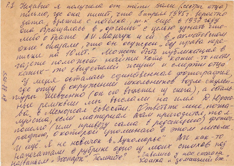 P.S. Недавно я получила от тёти Вали (сестры отца) письмо, где она пишет, что 8 апреля 1945 г. вероятно дата, взятая с потолка, т.к. ещё в 1937 году она обращалась в «органы» с целью узнать что-либо о брате А.И. Манчук и ей в «ахматовском окне» сказали, что он осуждён «без права переписки на 10 лет». Может быть публикация в газете поможет найти хоть какие-то нити, каких-то свидетелей жизни и смерти отца. У меня осталась единственная фотография, где отец в окружении школьников возле скульптуры Шевченко (он его вылепил из снега), а остальные реликвии мы выслали на имя Д. Юрасова, в Мемореал совести. Ответьте мне, пожалуйста, если материал вам пригодится, то я пошлю (или привезу сама в редакцию) фотографию, о которой упоминаю в этом письме. И ещё. Я не новичок в «Лукоморье». Вы как-то напечатали в рубрике одно из моих стихов под названьем «Зоопарк». Помните? «Завелись у нас сначала кошка и домашний ёж»…